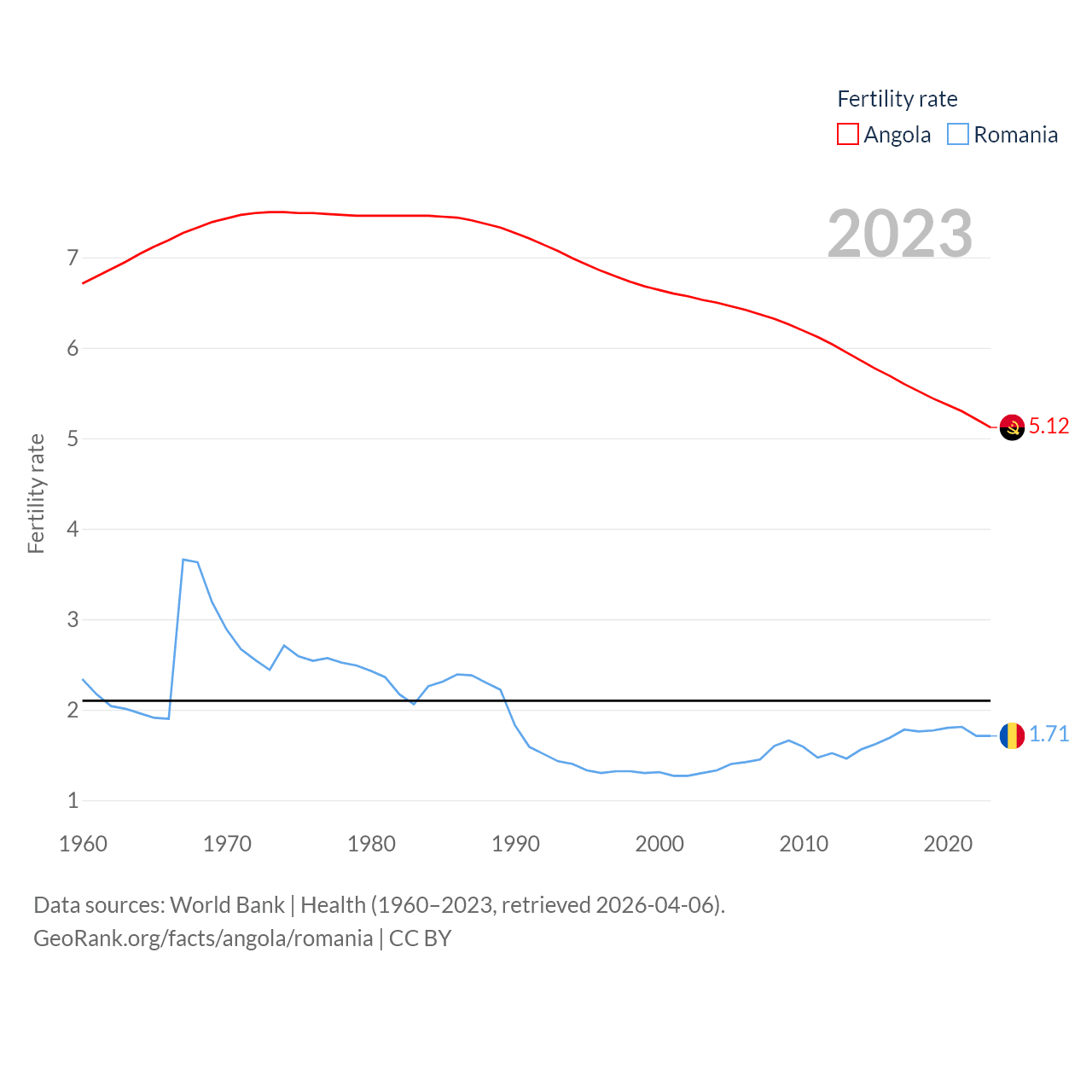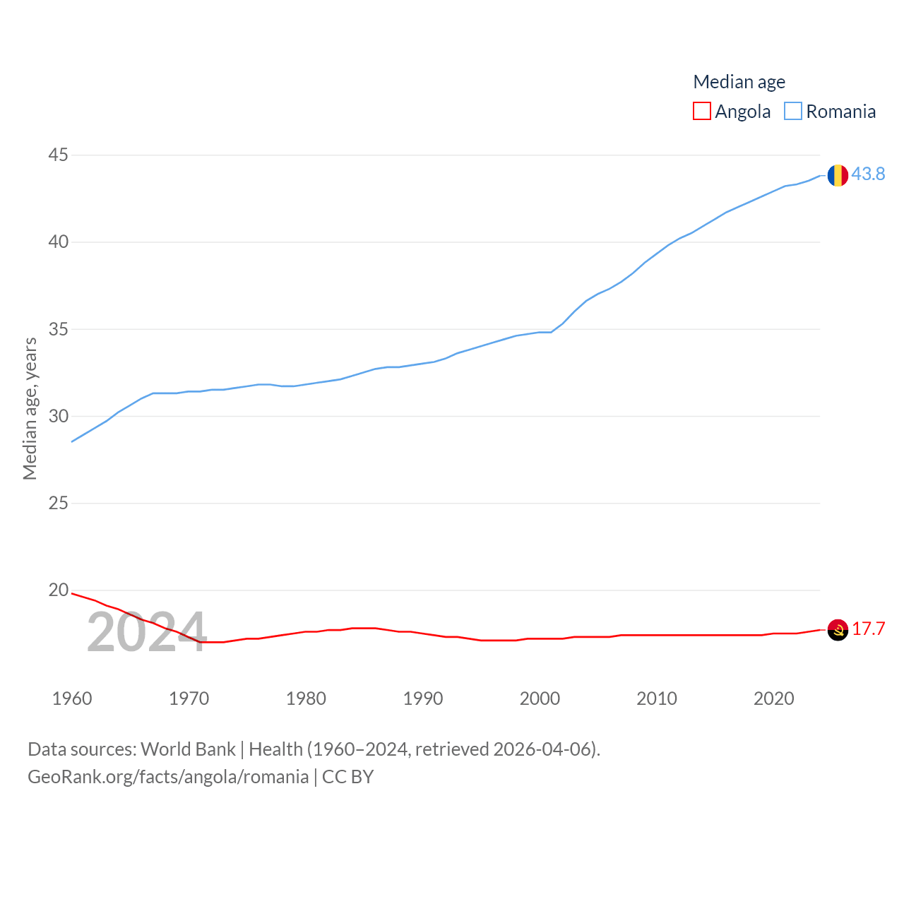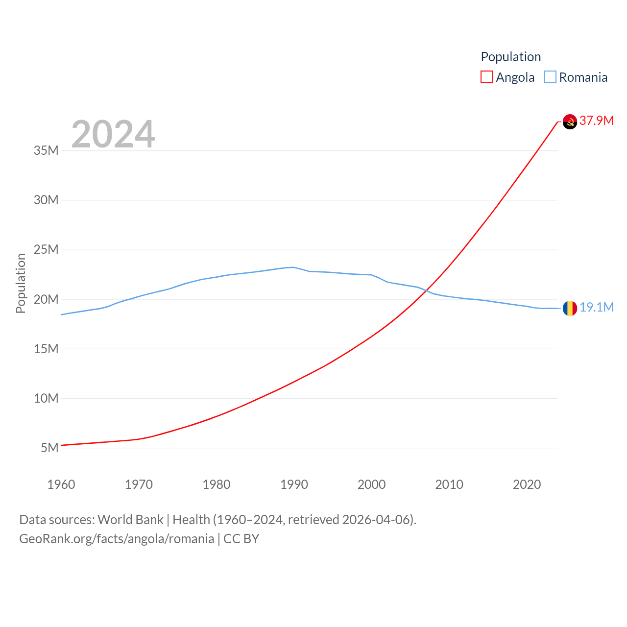 Angola has a population of 37.9M (ranked 40/197), compared with 19.1M in Romania (ranked 67/197). Angola's land area is 481,354 sq mi versus 88,834 sq mi for Romania (ranked 22nd vs. 80th).