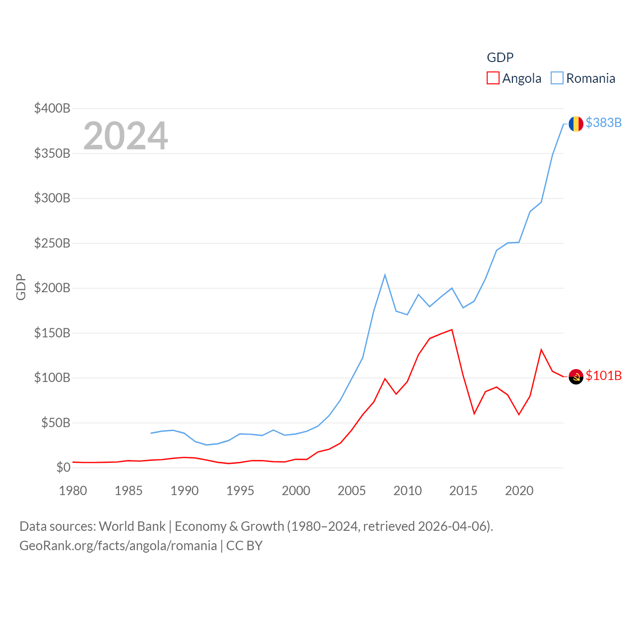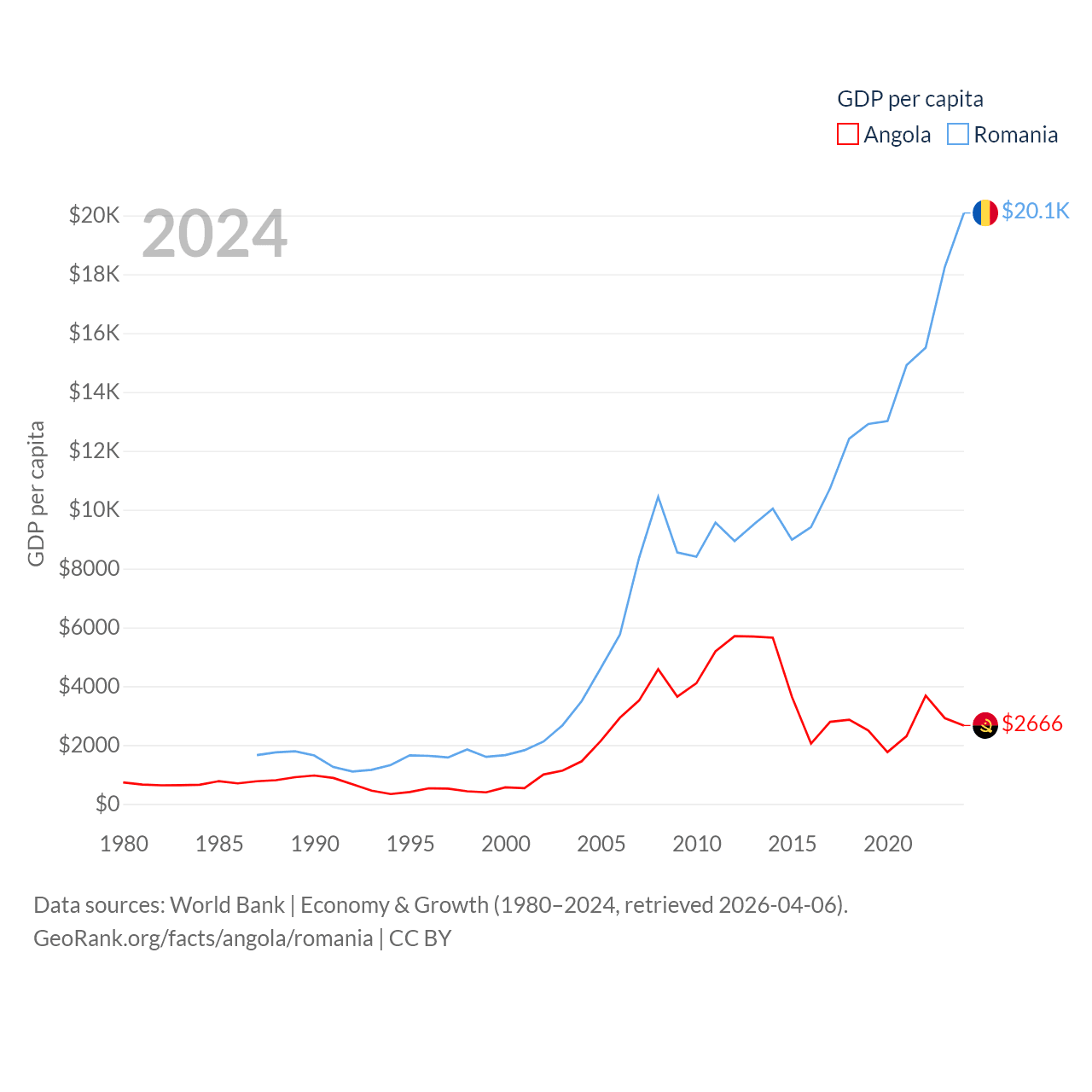 By GDP, Angola ranks 71/197 ($101B) and Romania ranks 42/197 ($383B). By GDP per capita, Angola ranks 144/197 ($2,666), while Romania ranks 58/197 ($20,080).