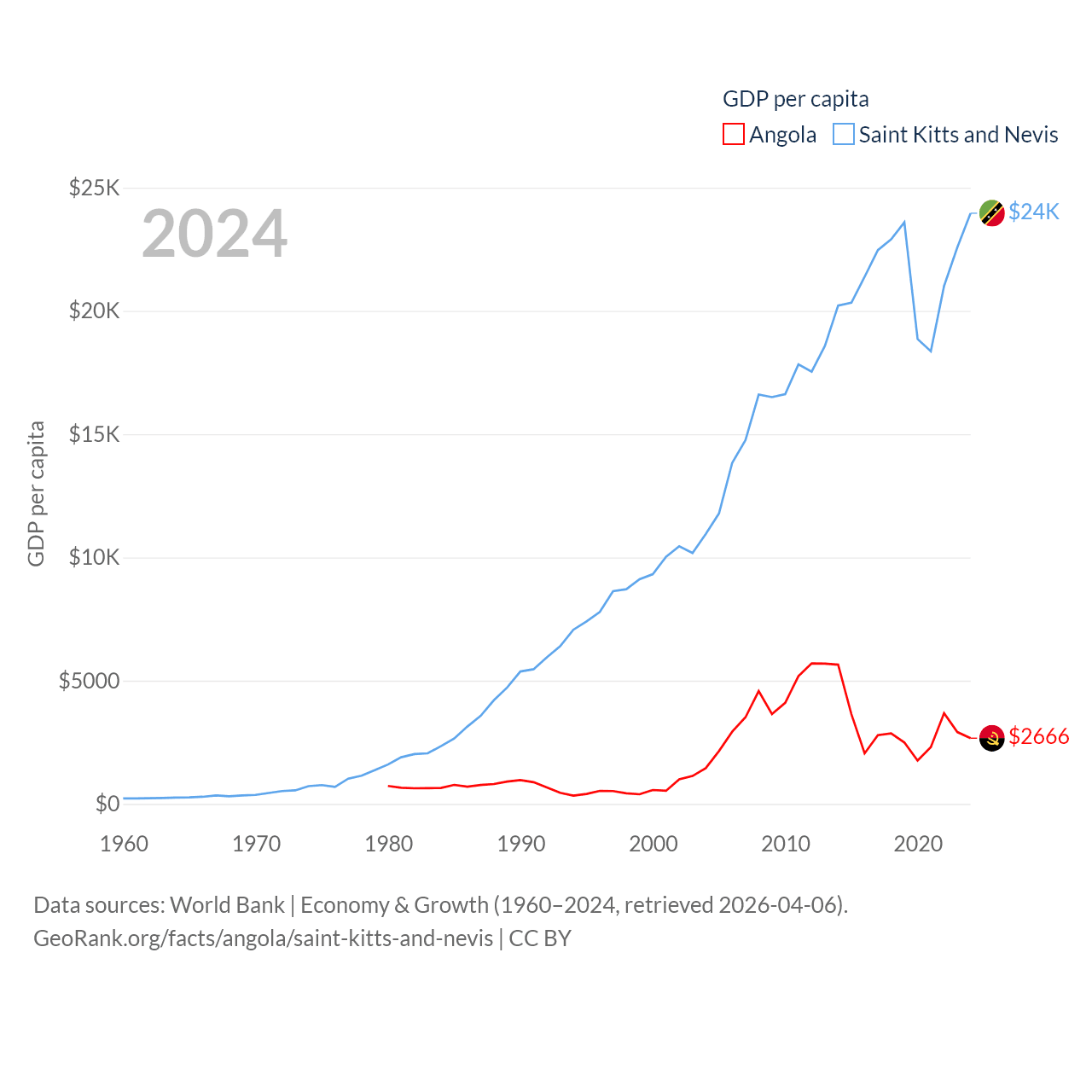 By GDP, Angola ranks 71/197 ($101B) and Saint Kitts and Nevis ranks 187/197 ($1.12B). By GDP per capita, Angola ranks 144/197 ($2,666), while Saint Kitts and Nevis ranks 51/197 ($23,961).