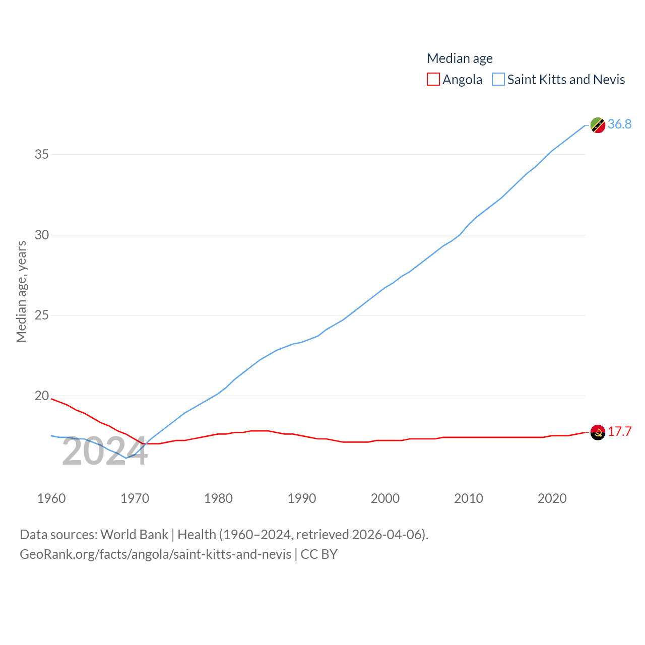 Angola has a population of 37.9M (ranked 40/197), compared with 46.8K in Saint Kitts and Nevis (ranked 189/197). Angola's land area is 481,354 sq mi versus 100.4 sq mi for Saint Kitts and Nevis (ranked 22nd vs. 189th).