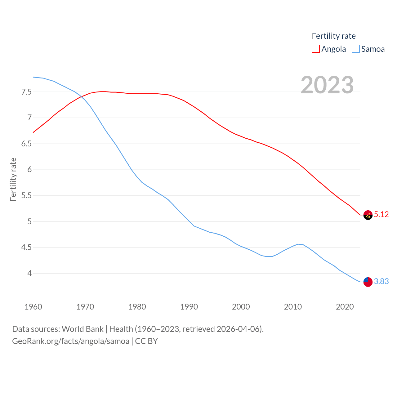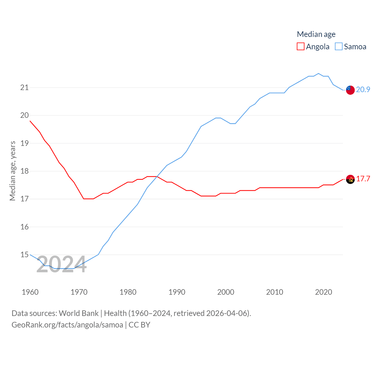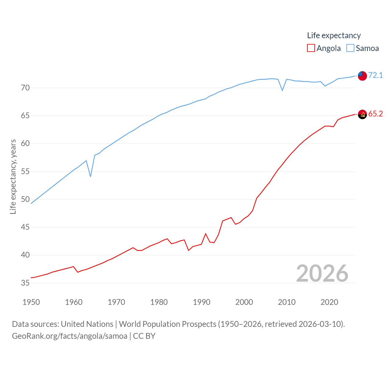 Angola has a population of 37.9M (ranked 40/197), compared with 218K in Samoa (ranked 177/197). Angola's land area is 481,354 sq mi versus 1,073 sq mi for Samoa (ranked 22nd vs. 168th).