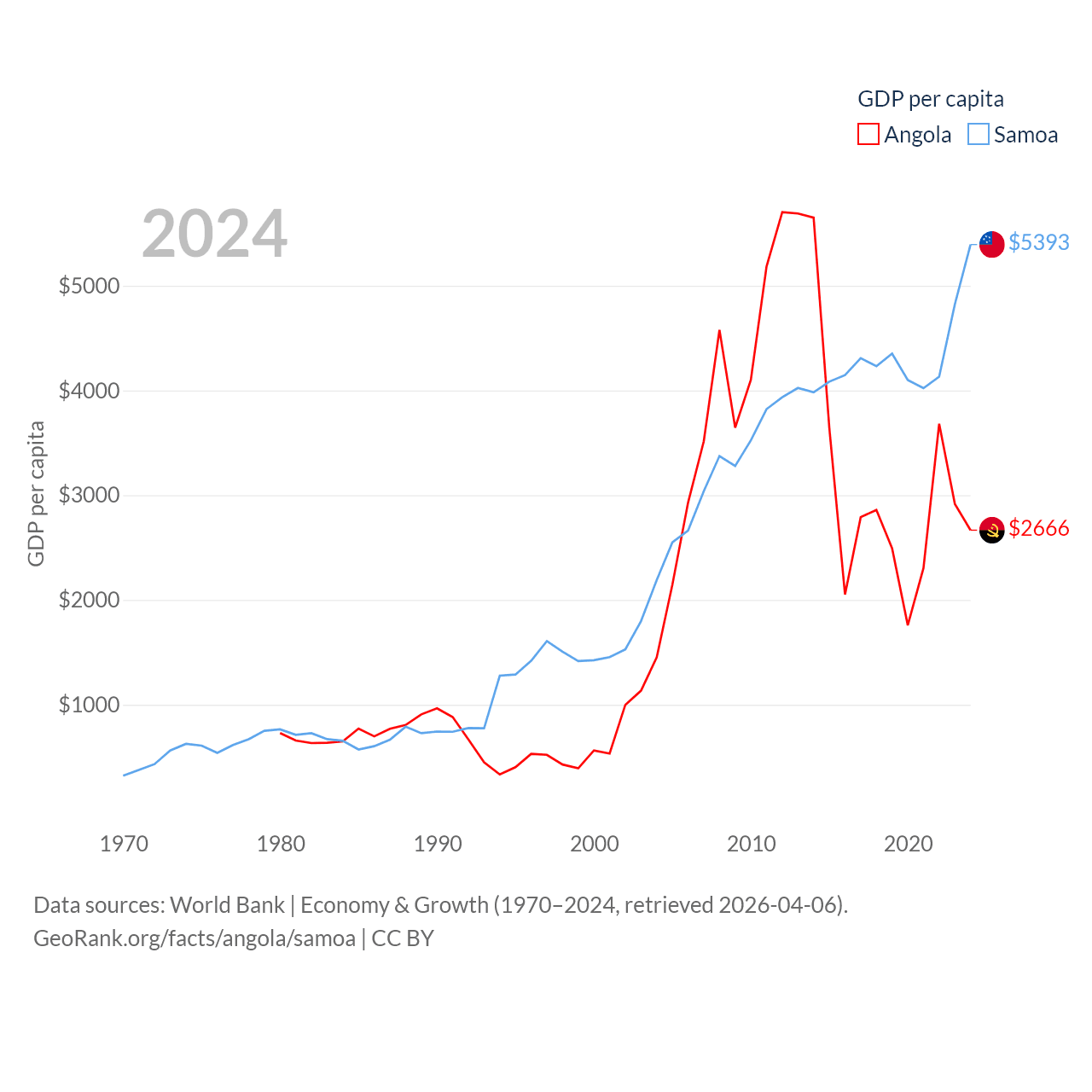 By GDP, Angola ranks 71/197 ($101B) and Samoa ranks 185/197 ($1.18B). By GDP per capita, Angola ranks 144/197 ($2,666), while Samoa ranks 117/197 ($5,393).