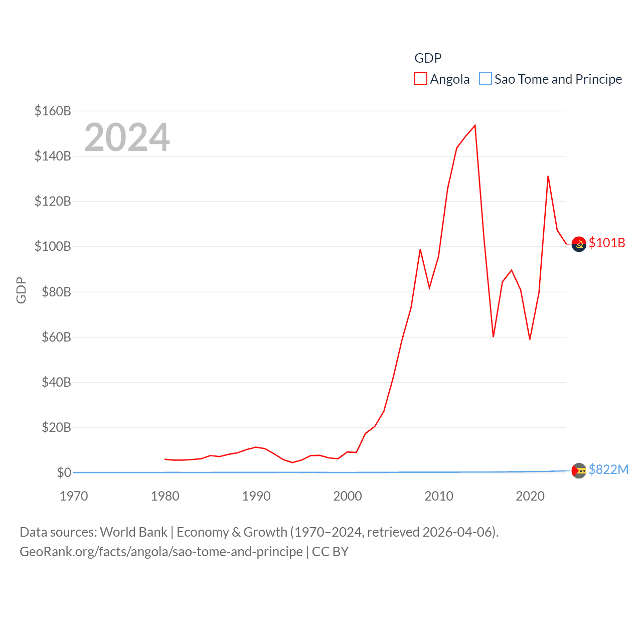 By GDP, Angola ranks 71/197 ($101B) and Sao Tome and Principe ranks 189/197 ($822M). By GDP per capita, Angola ranks 144/197 ($2,666), while Sao Tome and Principe ranks 134/197 ($3,491).