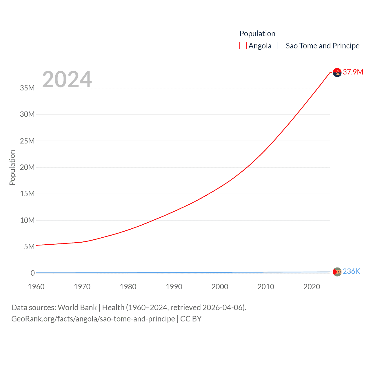 Angola has a population of 37.9M (ranked 40/197), compared with 236K in Sao Tome and Principe (ranked 176/197). Angola's land area is 481,354 sq mi versus 371 sq mi for Sao Tome and Principe (ranked 22nd vs. 172nd).