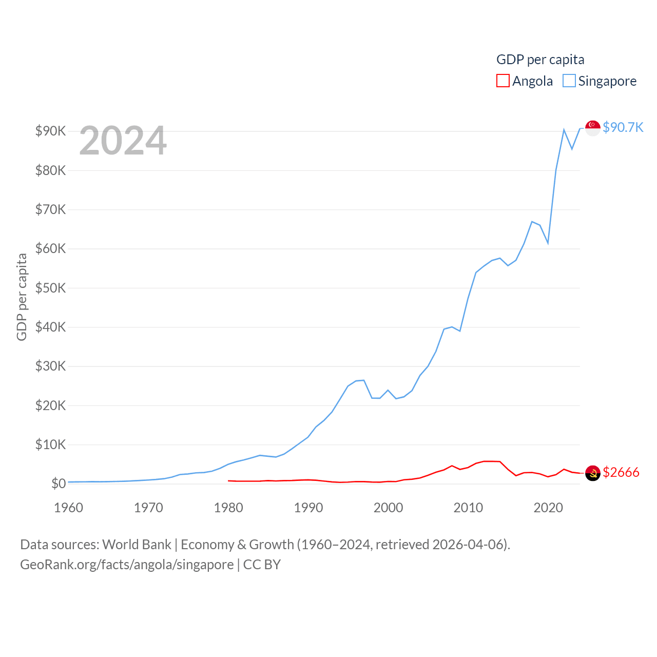 By GDP, Angola ranks 71/197 ($101B) and Singapore ranks 28/197 ($547B). By GDP per capita, Angola ranks 144/197 ($2,666), while Singapore ranks 7/197 ($90,674).