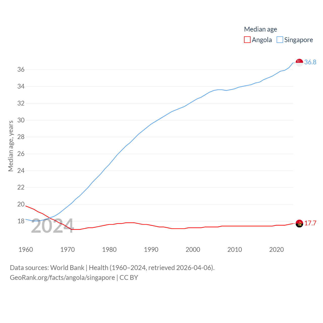 Angola has a population of 37.9M (ranked 40/197), compared with 6.04M in Singapore (ranked 113/197). Angola's land area is 481,354 sq mi versus 277.2 sq mi for Singapore (ranked 22nd vs. 177th).