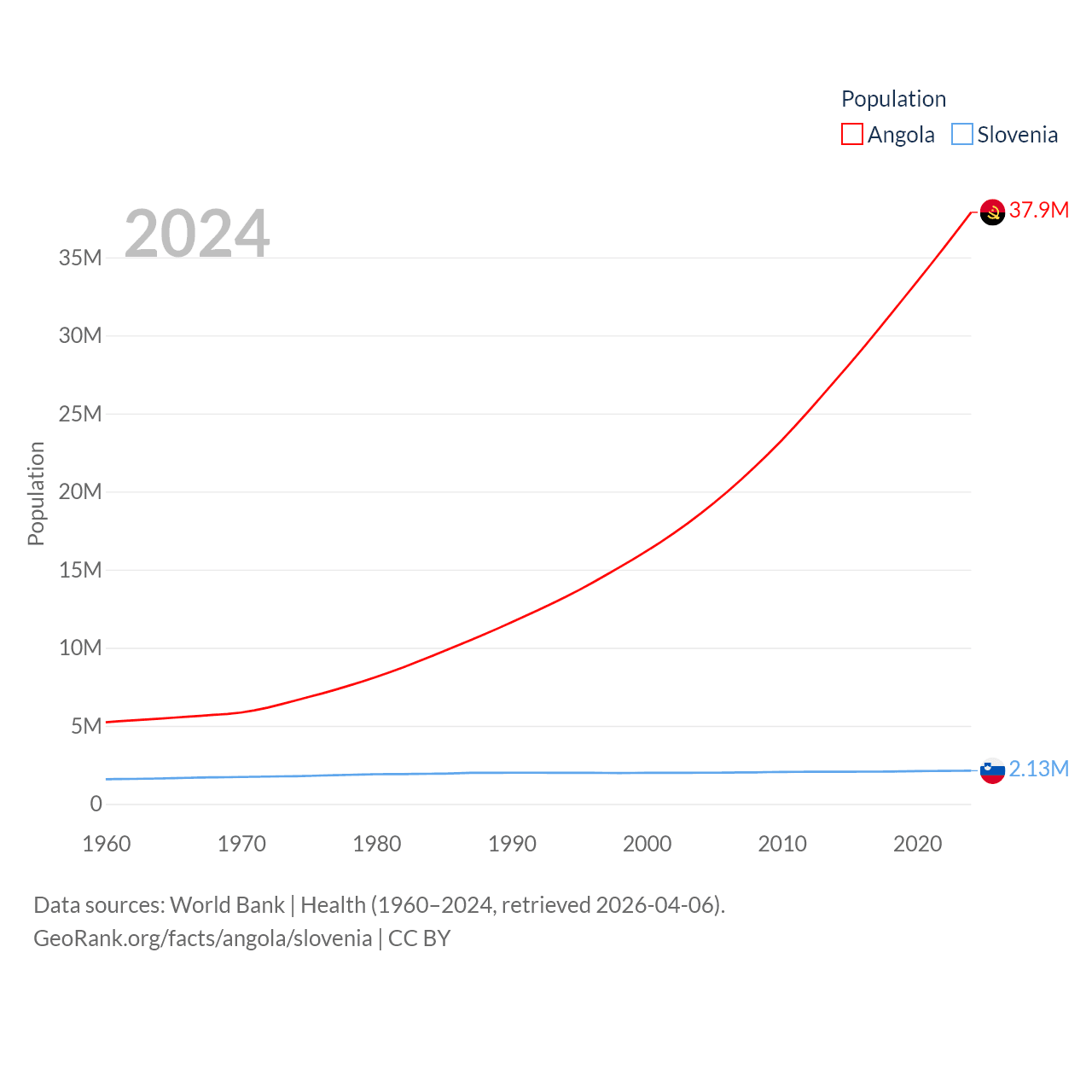 Angola has a population of 37.9M (ranked 40/197), compared with 2.13M in Slovenia (ranked 147/197). Angola's land area is 481,354 sq mi versus 7,774 sq mi for Slovenia (ranked 22nd vs. 151st).