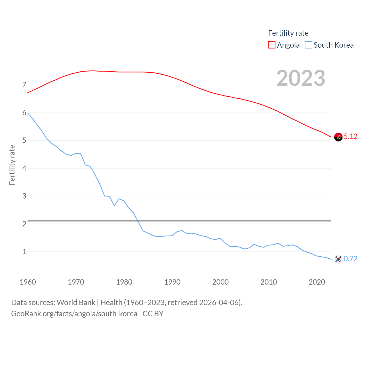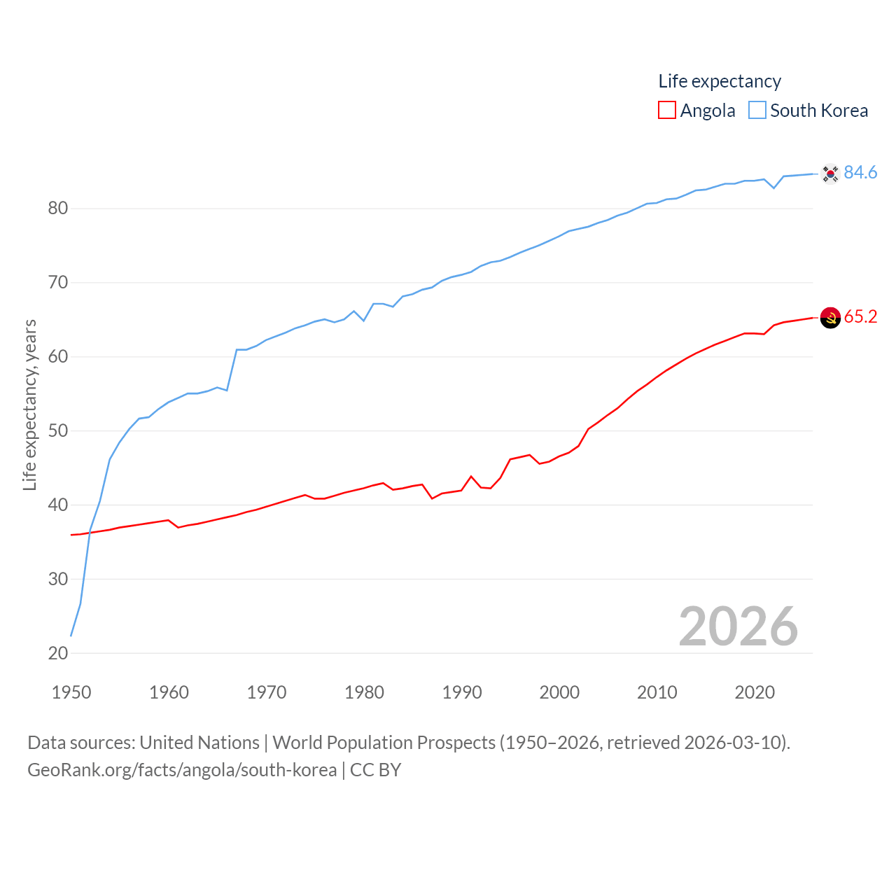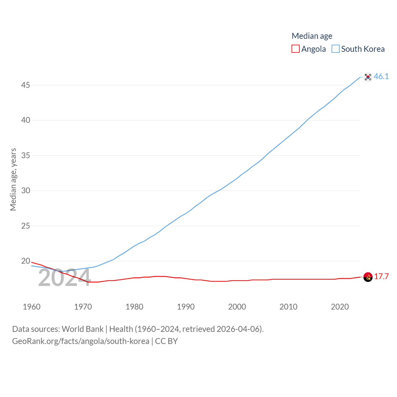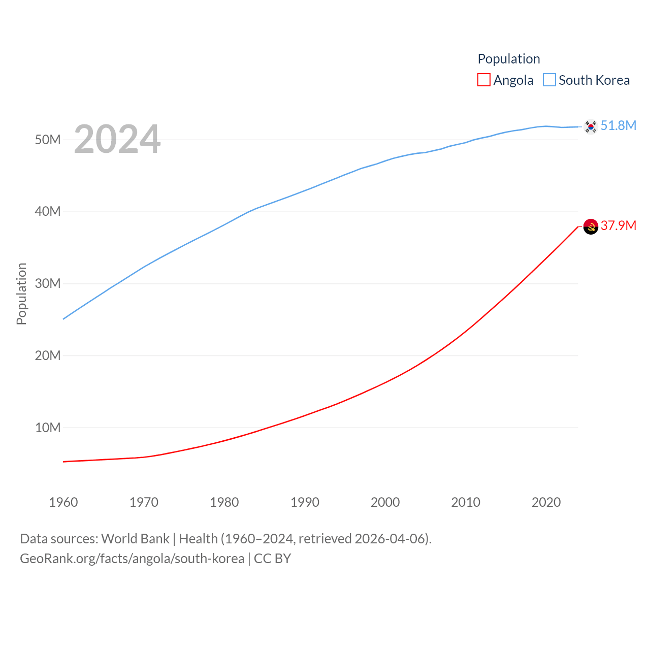 Angola has a population of 37.9M (ranked 40/197), compared with 51.8M in South Korea (ranked 29/197). Angola's land area is 481,354 sq mi versus 37,684 sq mi for South Korea (ranked 22nd vs. 105th).