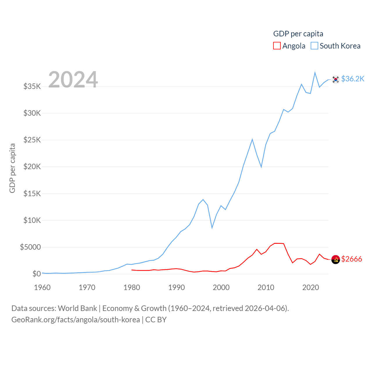 By GDP, Angola ranks 71/197 ($101B) and South Korea ranks 12/197 ($1.88T). By GDP per capita, Angola ranks 144/197 ($2,666), while South Korea ranks 31/197 ($36,239).