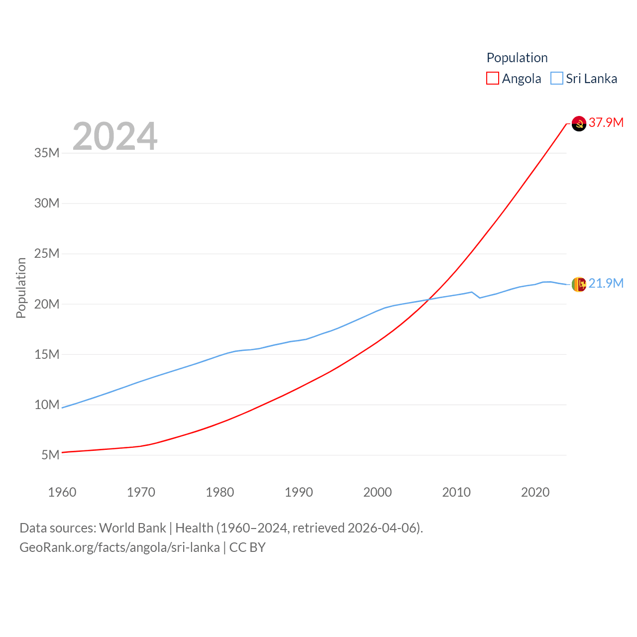 Angola has a population of 37.9M (ranked 40/197), compared with 21.9M in Sri Lanka (ranked 61/197). Angola's land area is 481,354 sq mi versus 23,884 sq mi for Sri Lanka (ranked 22nd vs. 122nd).