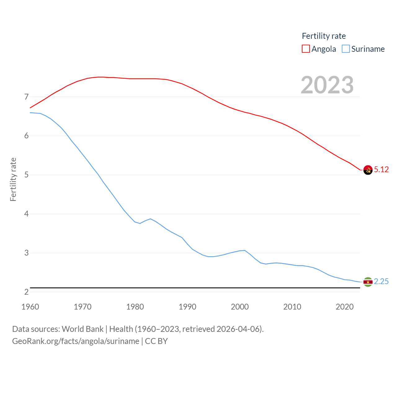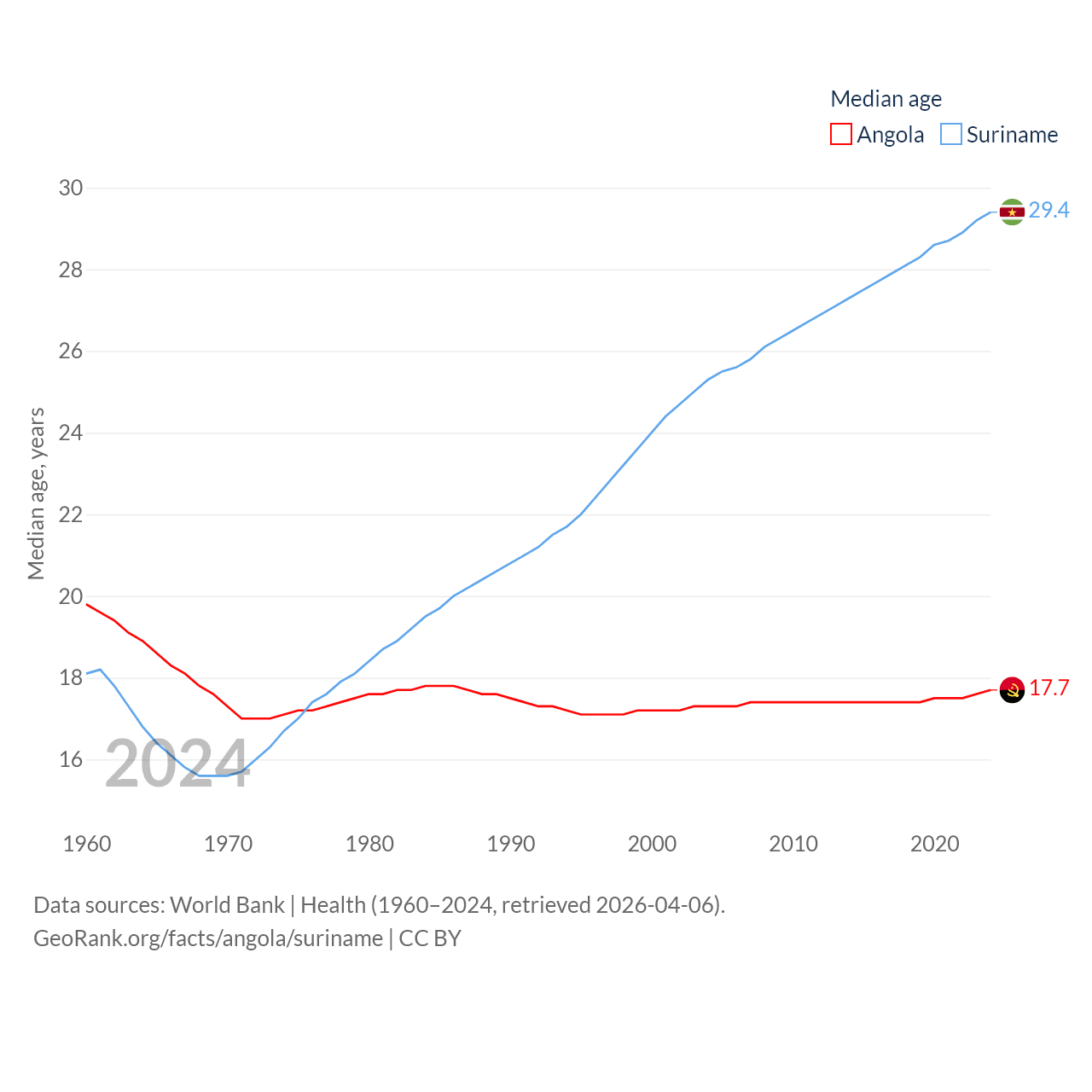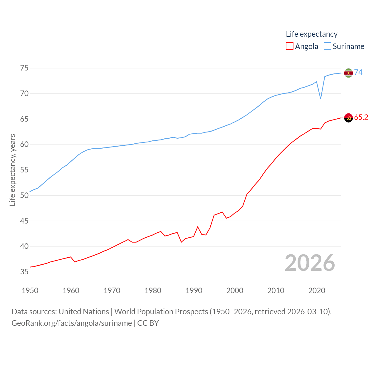 Angola has a population of 37.9M (ranked 40/197), compared with 634K in Suriname (ranked 165/197). Angola's land area is 481,354 sq mi versus 61,972 sq mi for Suriname (ranked 22nd vs. 90th).