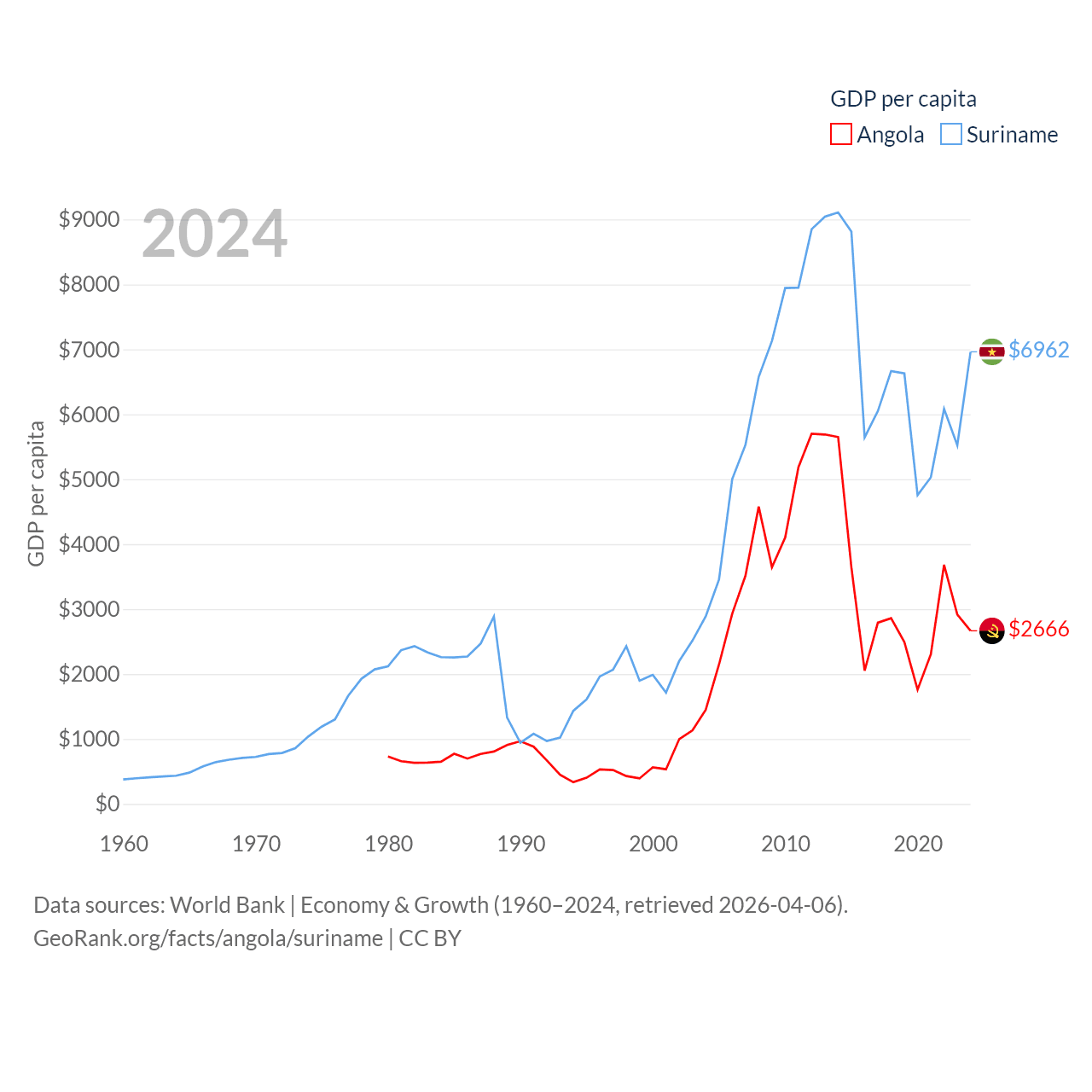 By GDP, Angola ranks 71/197 ($101B) and Suriname ranks 164/197 ($4.42B). By GDP per capita, Angola ranks 144/197 ($2,666), while Suriname ranks 102/197 ($6,962).