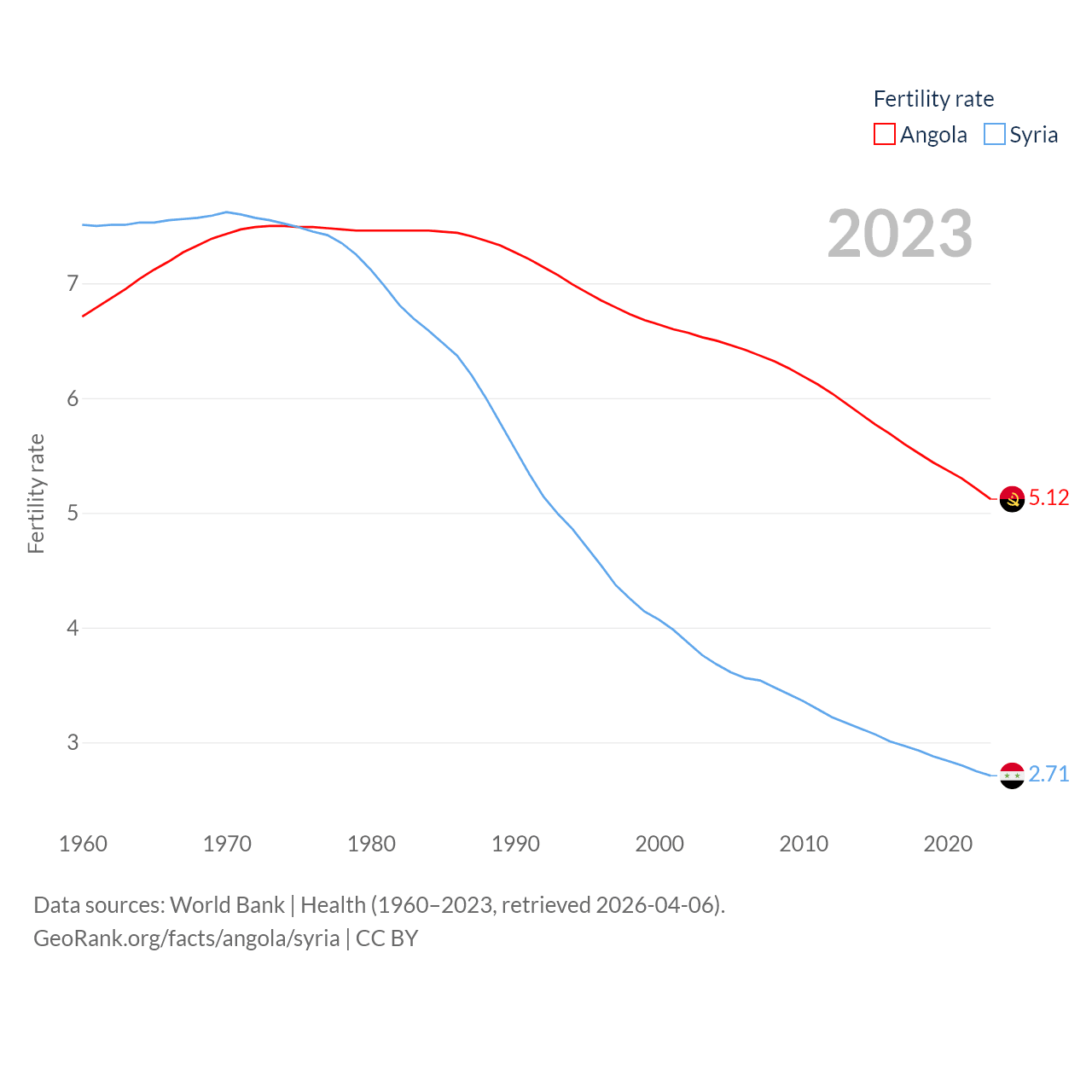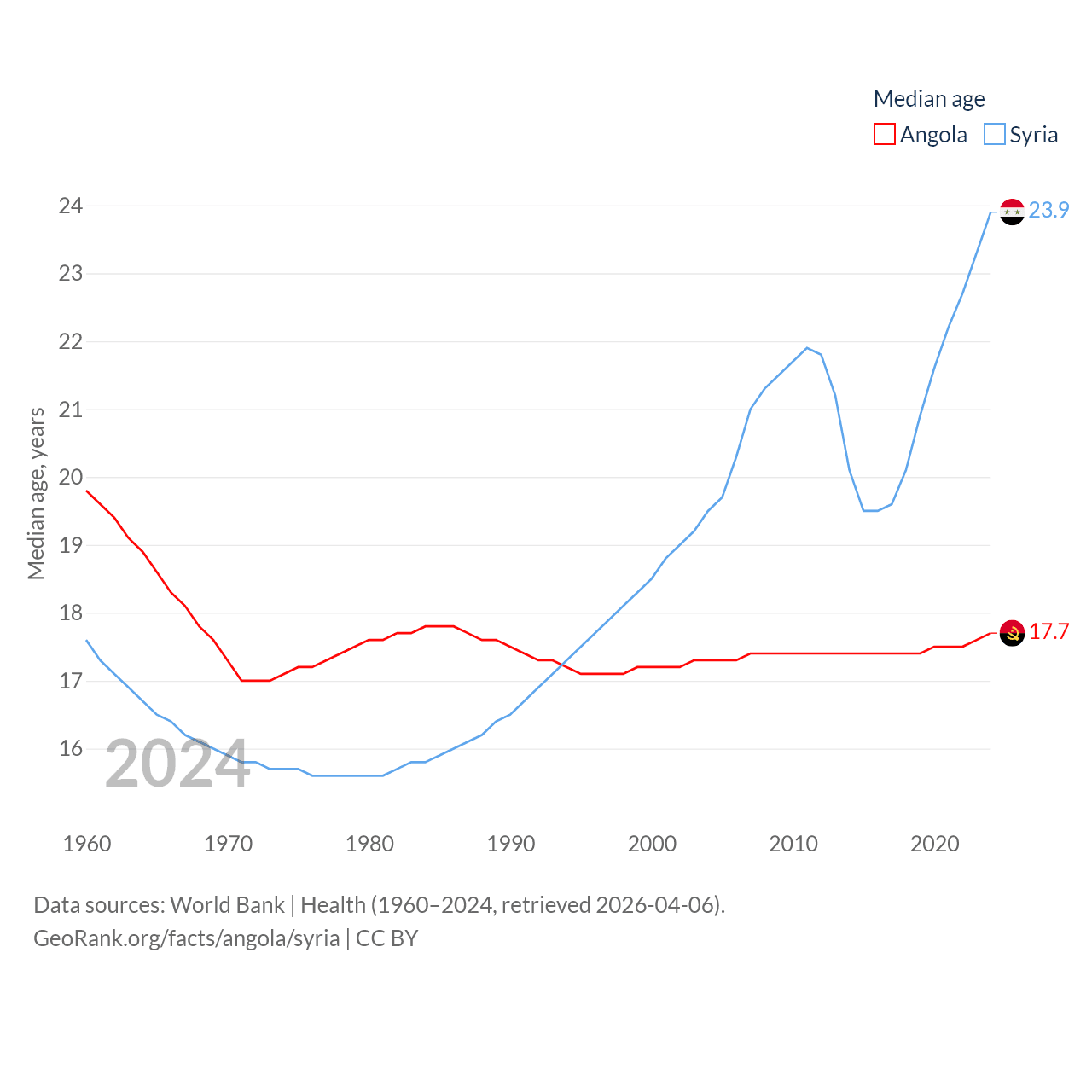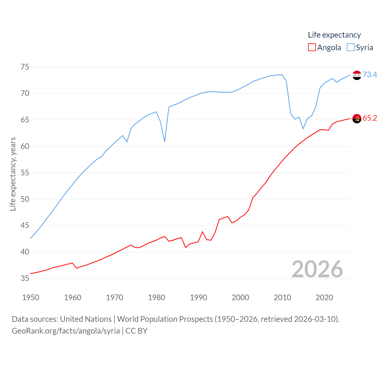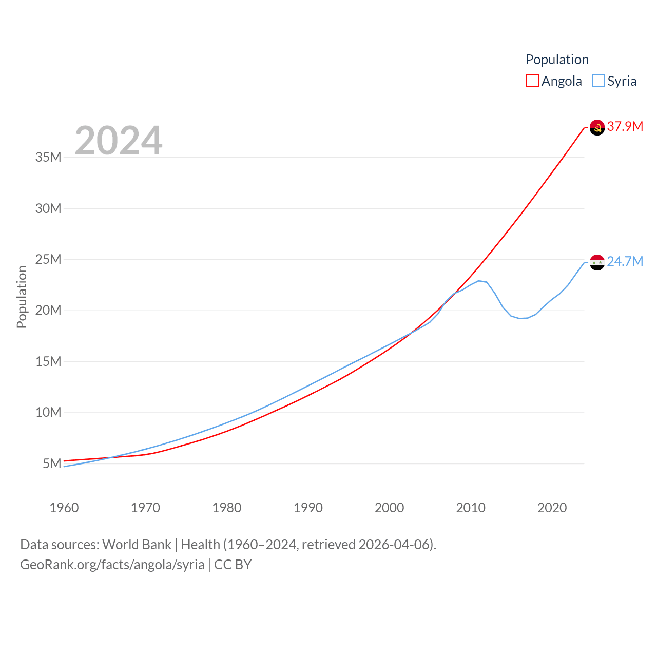 Angola has a population of 37.9M (ranked 40/197), compared with 24.7M in Syria (ranked 57/197). Angola's land area is 481,354 sq mi versus 70,900 sq mi for Syria (ranked 22nd vs. 87th).