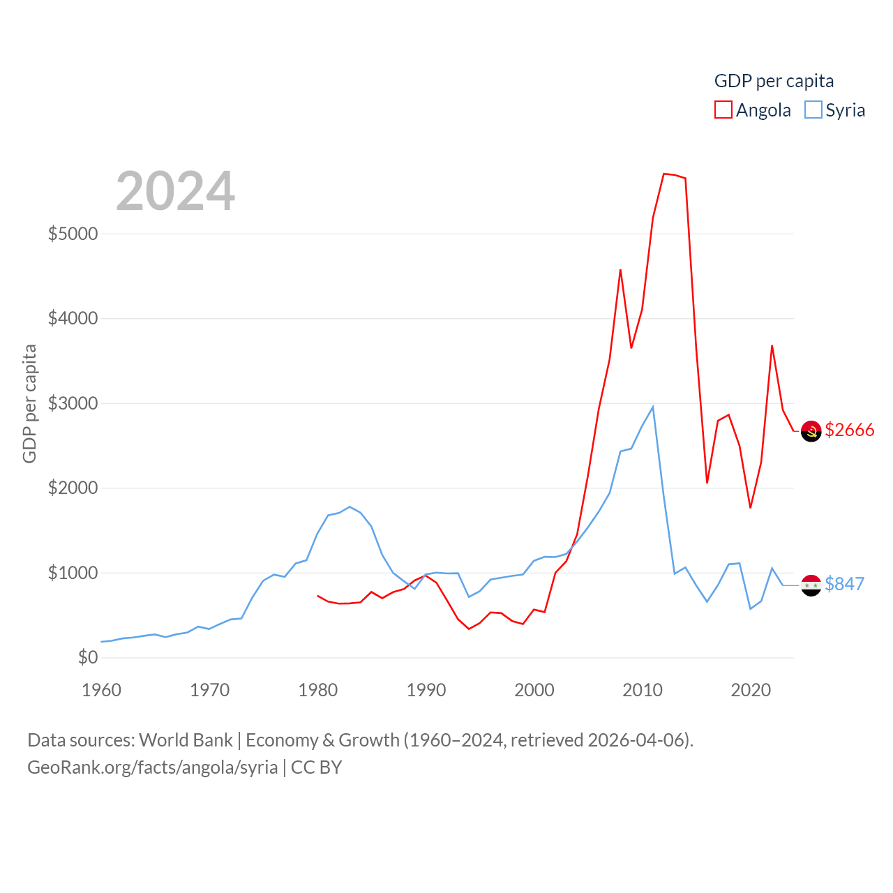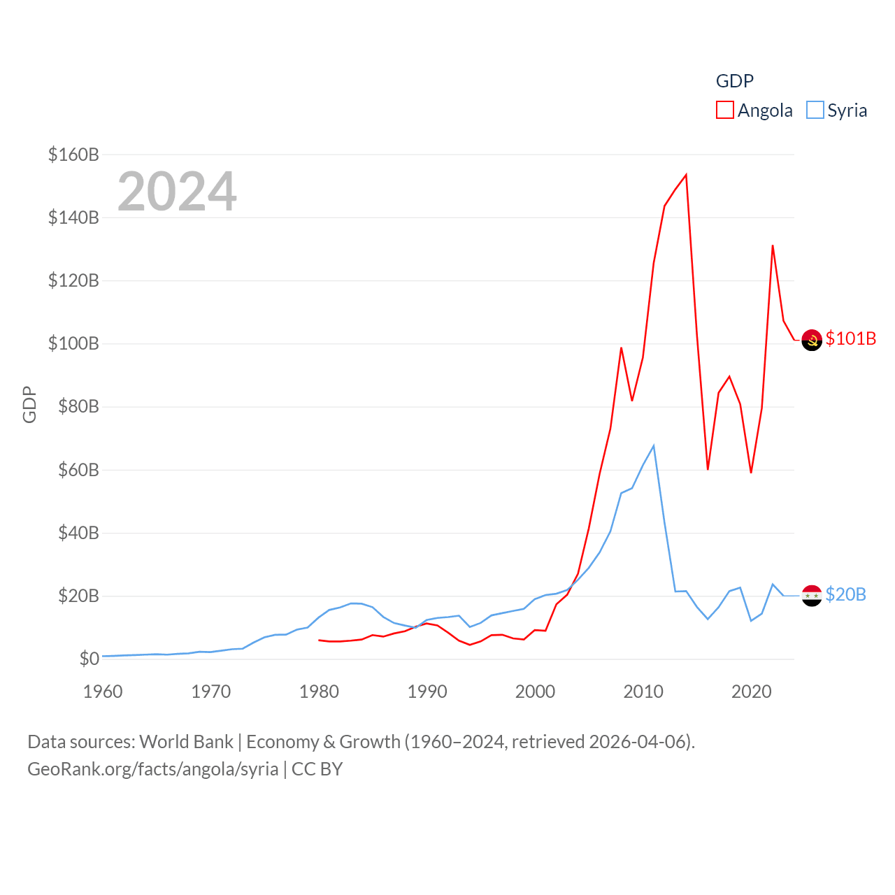 By GDP, Angola ranks 71/197 ($101B) and Syria ranks 129/197 ($20B). By GDP per capita, Angola ranks 144/197 ($2,666), while Syria ranks 185/197 ($847).