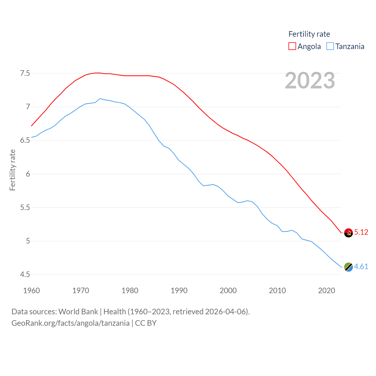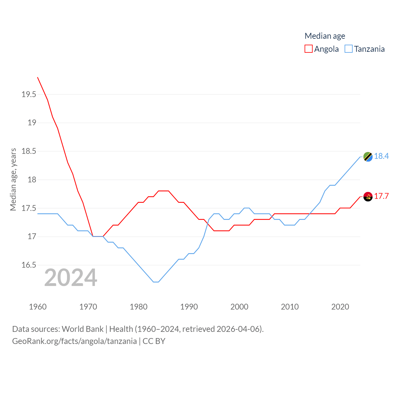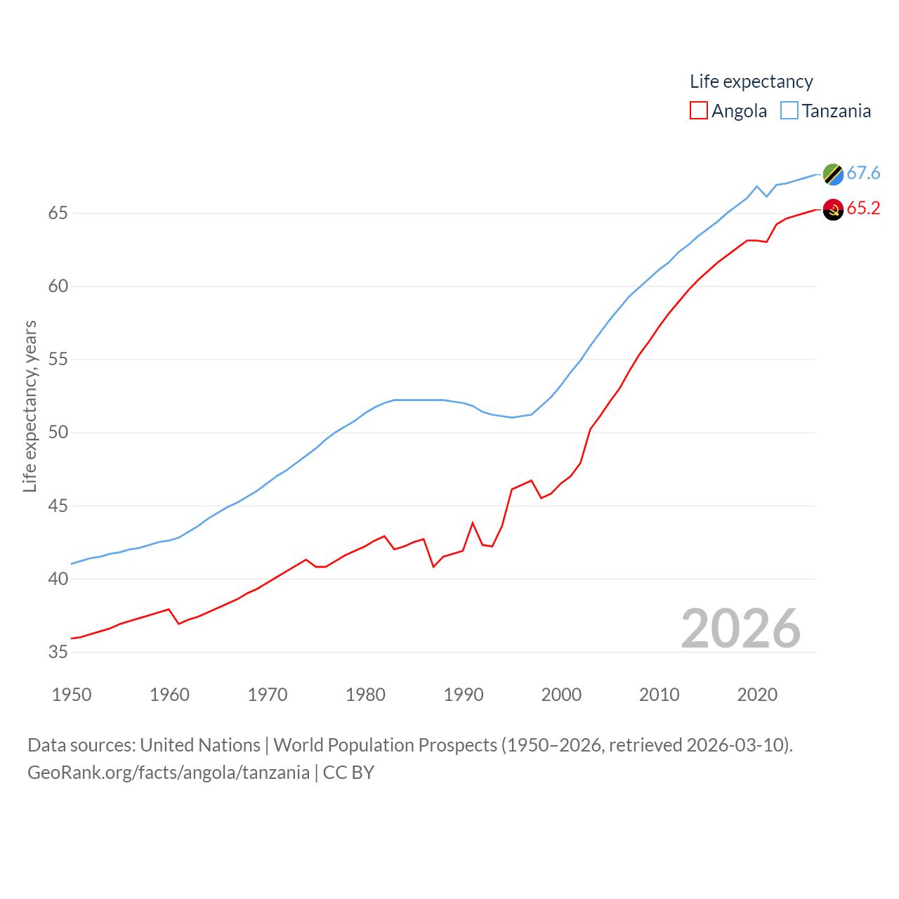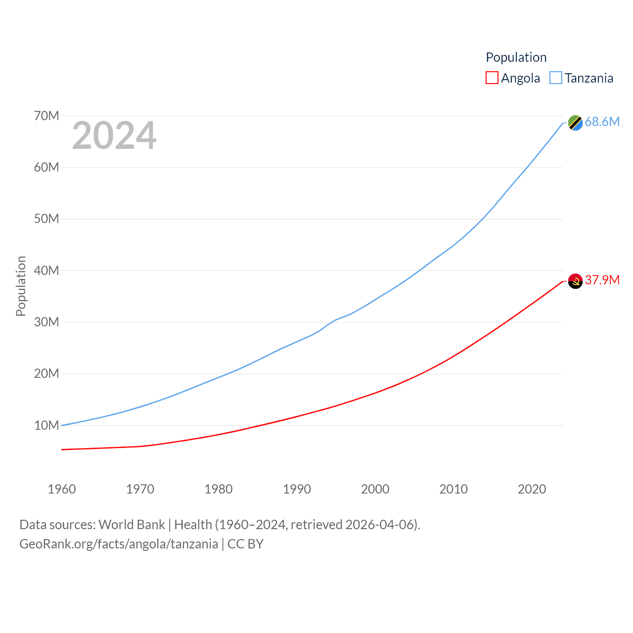 Angola has a population of 37.9M (ranked 40/197), compared with 68.6M in Tanzania (ranked 22/197). Angola's land area is 481,354 sq mi versus 342,009 sq mi for Tanzania (ranked 22nd vs. 31st).