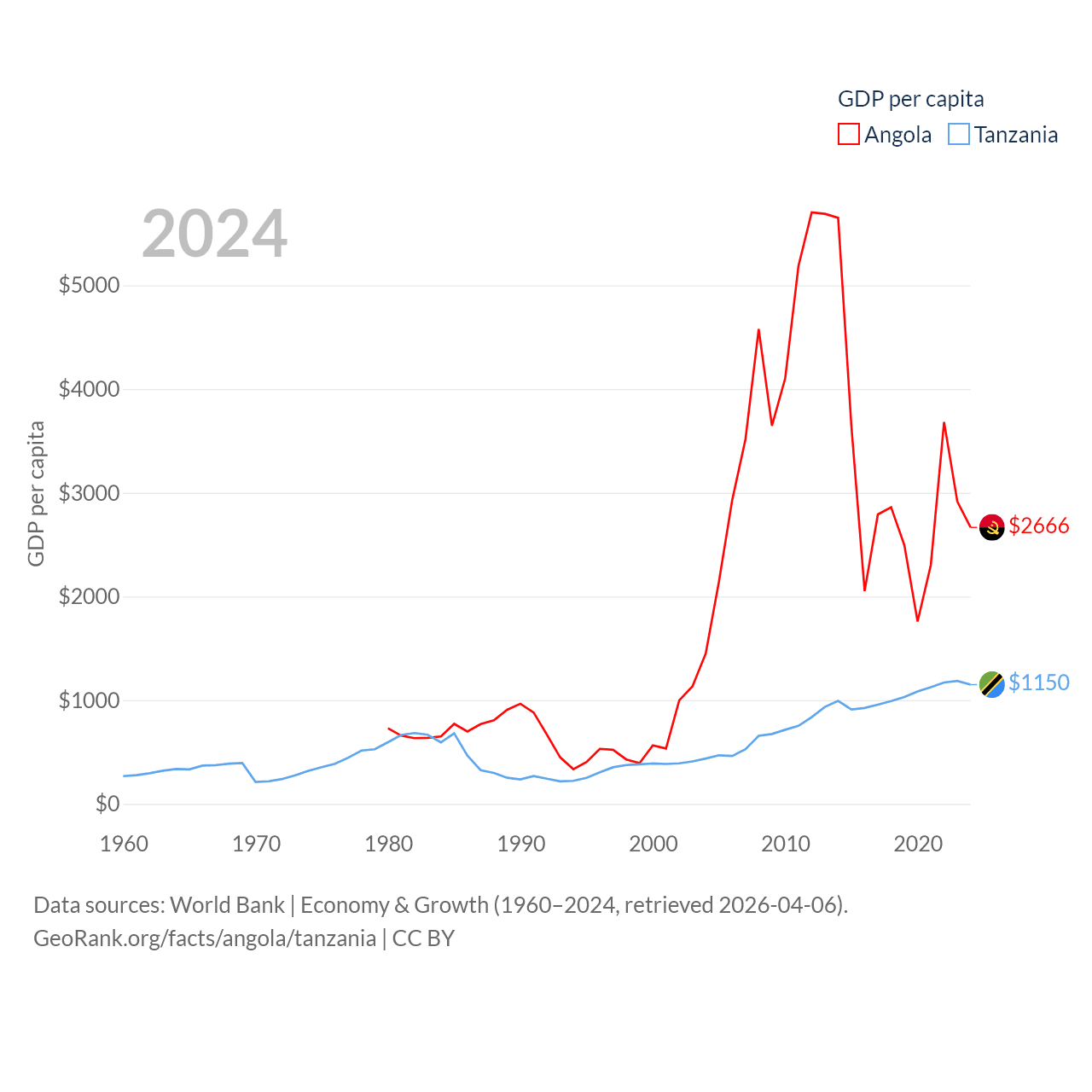 By GDP, Angola ranks 71/197 ($101B) and Tanzania ranks 82/197 ($78.8B). By GDP per capita, Angola ranks 144/197 ($2,666), while Tanzania ranks 170/197 ($1,150).