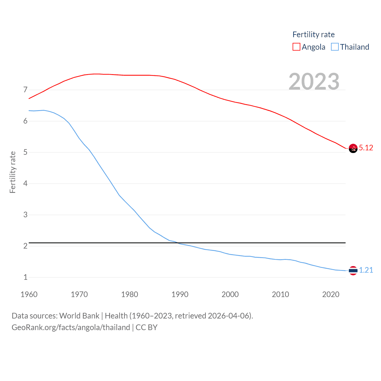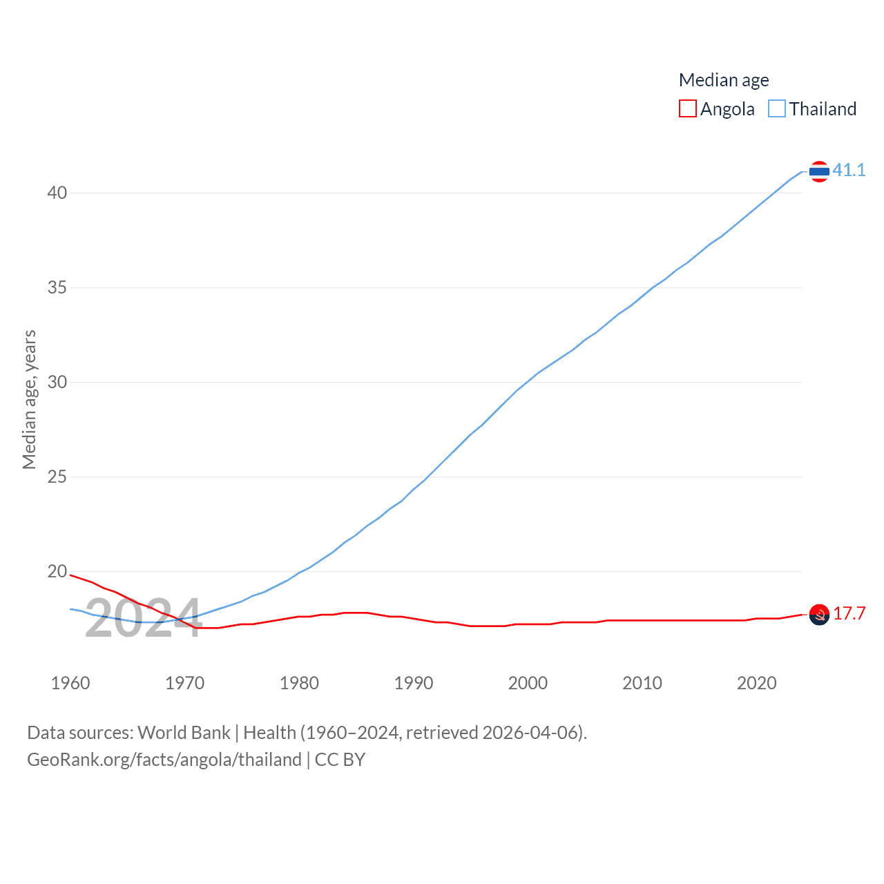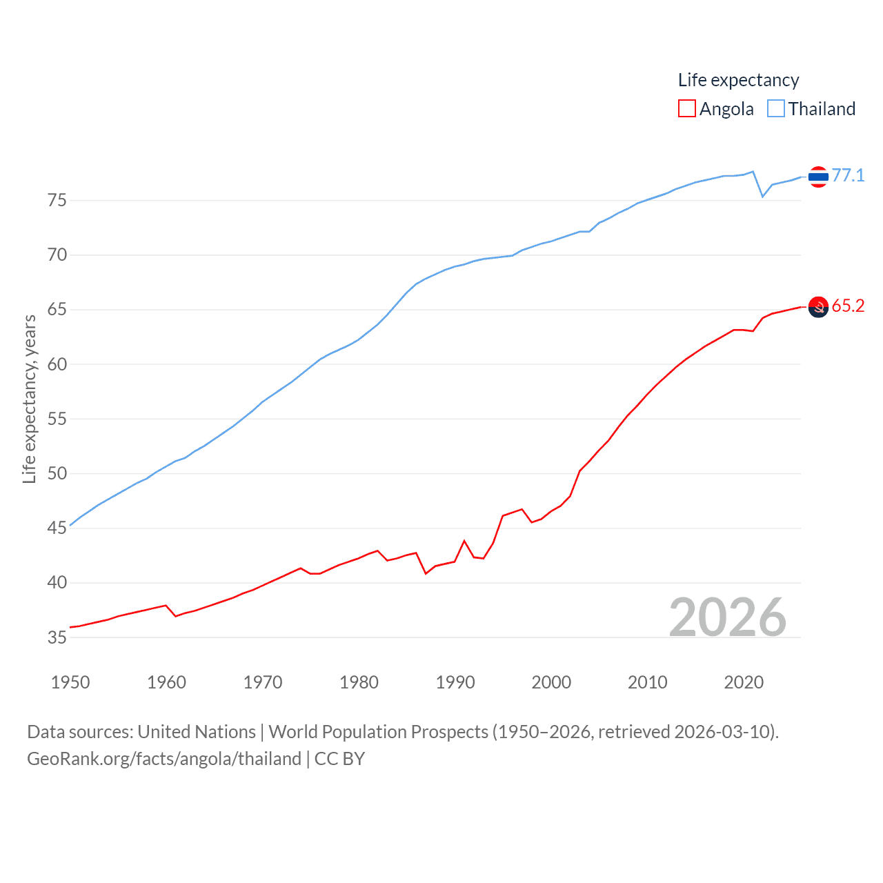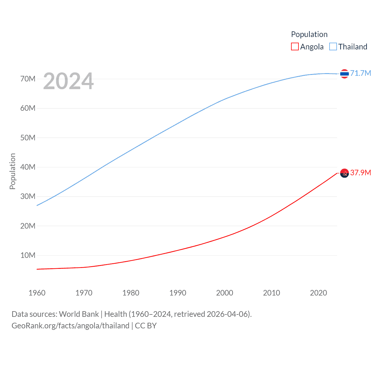 Angola has a population of 37.9M (ranked 40/197), compared with 71.7M in Thailand (ranked 20/197). Angola's land area is 481,354 sq mi versus 197,256 sq mi for Thailand (ranked 22nd vs. 50th).