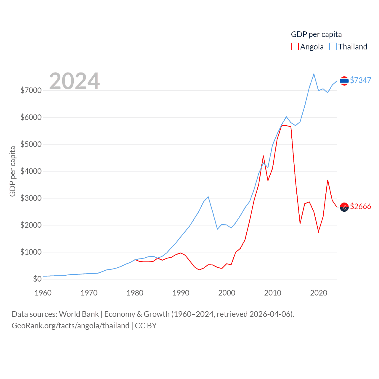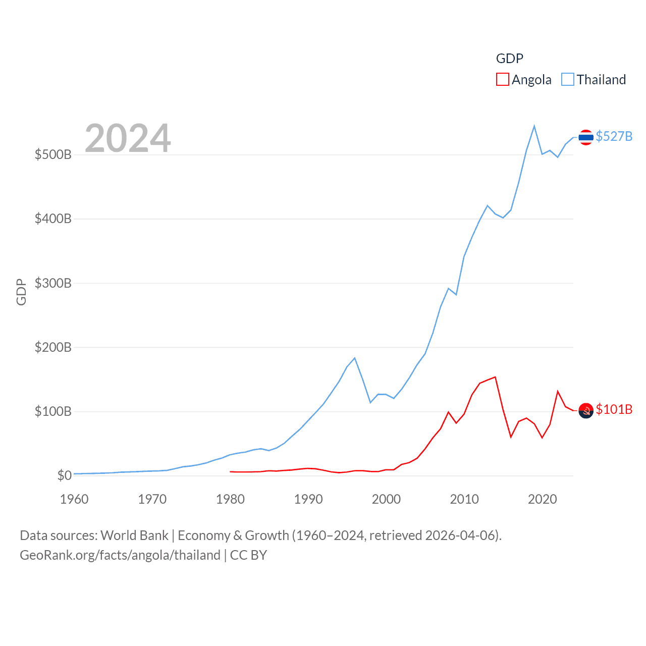 By GDP, Angola ranks 71/197 ($101B) and Thailand ranks 31/197 ($527B). By GDP per capita, Angola ranks 144/197 ($2,666), while Thailand ranks 100/197 ($7,347).