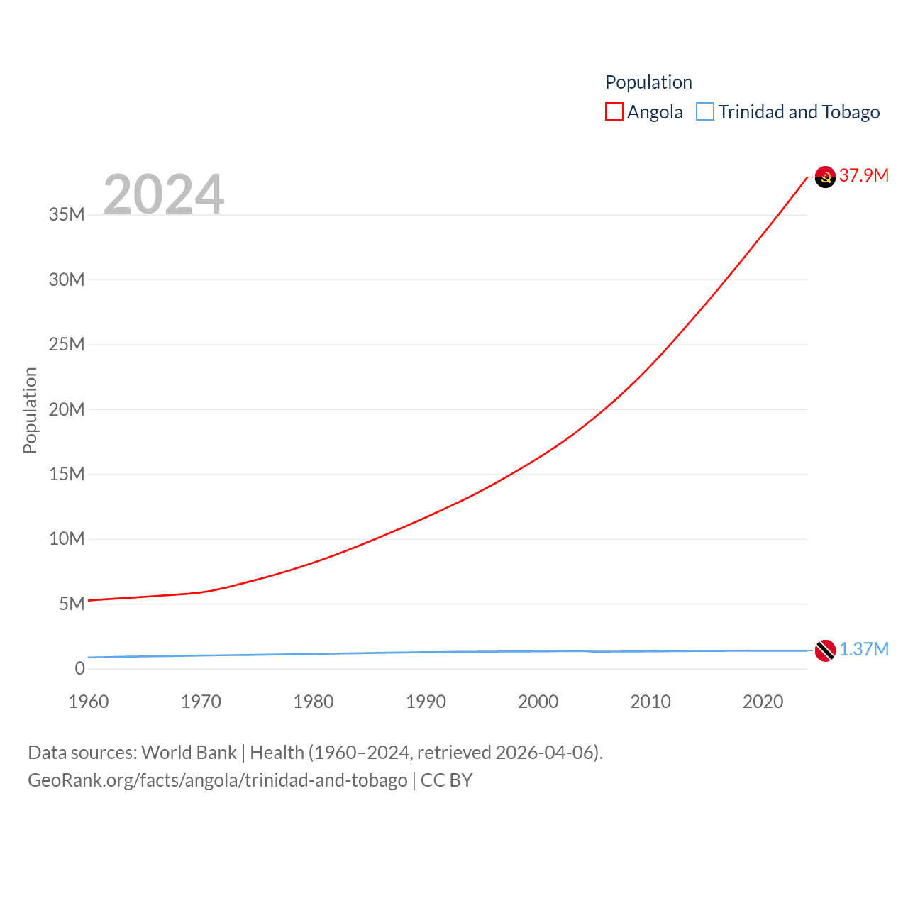 Angola has a population of 37.9M (ranked 40/197), compared with 1.37M in Trinidad and Tobago (ranked 154/197). Angola's land area is 481,354 sq mi versus 1,981 sq mi for Trinidad and Tobago (ranked 22nd vs. 166th).