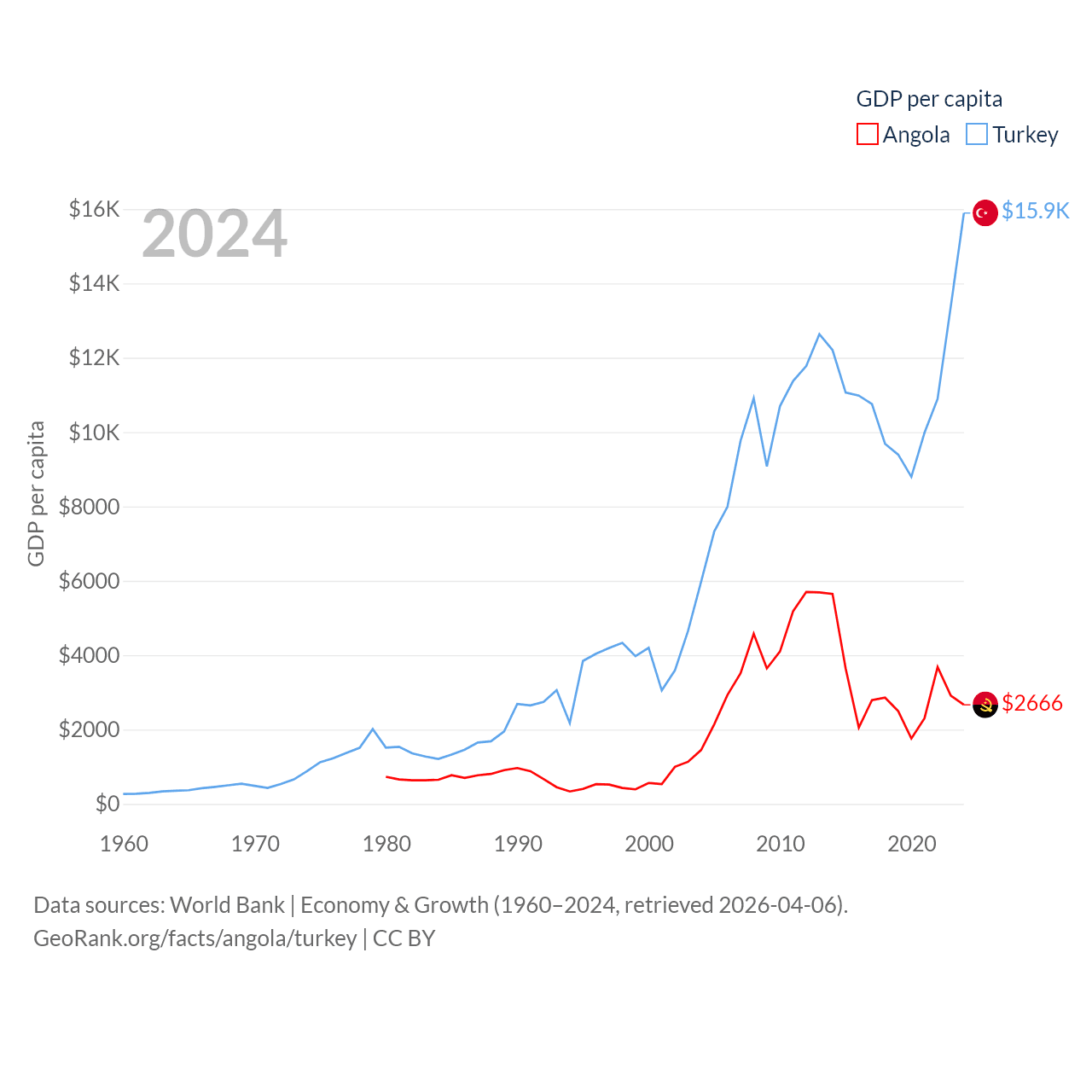 By GDP, Angola ranks 71/197 ($101B) and Turkey ranks 17/197 ($1.36T). By GDP per capita, Angola ranks 144/197 ($2,666), while Turkey ranks 66/197 ($15,893).