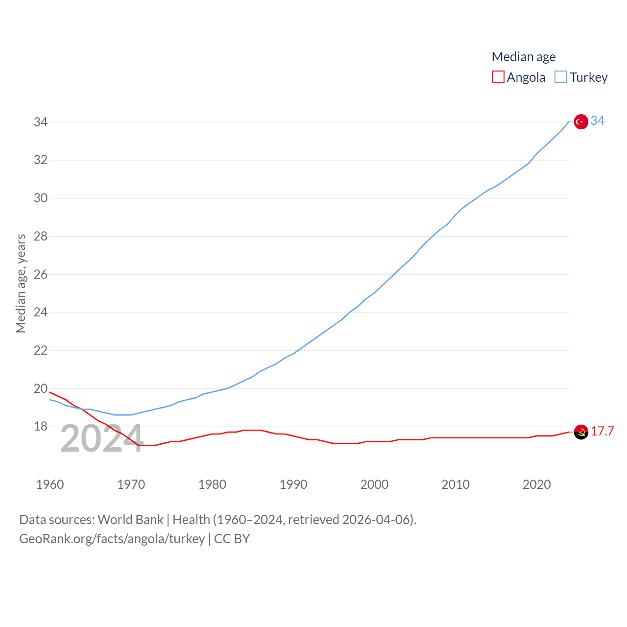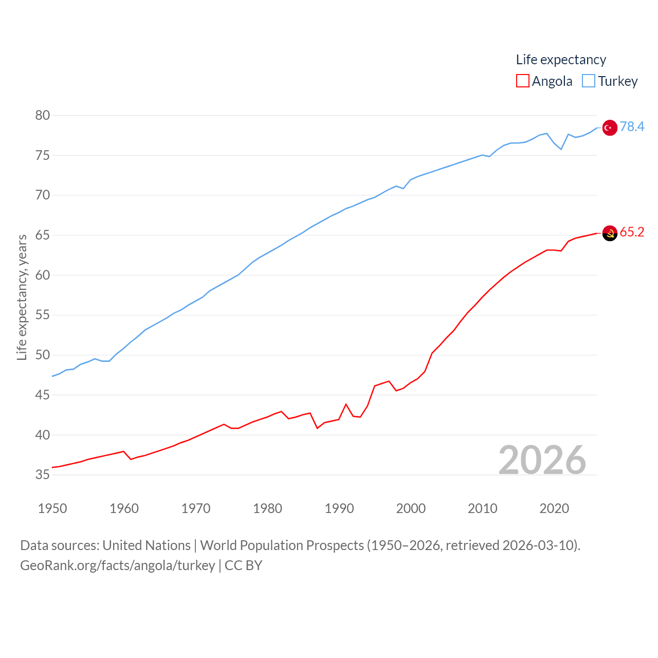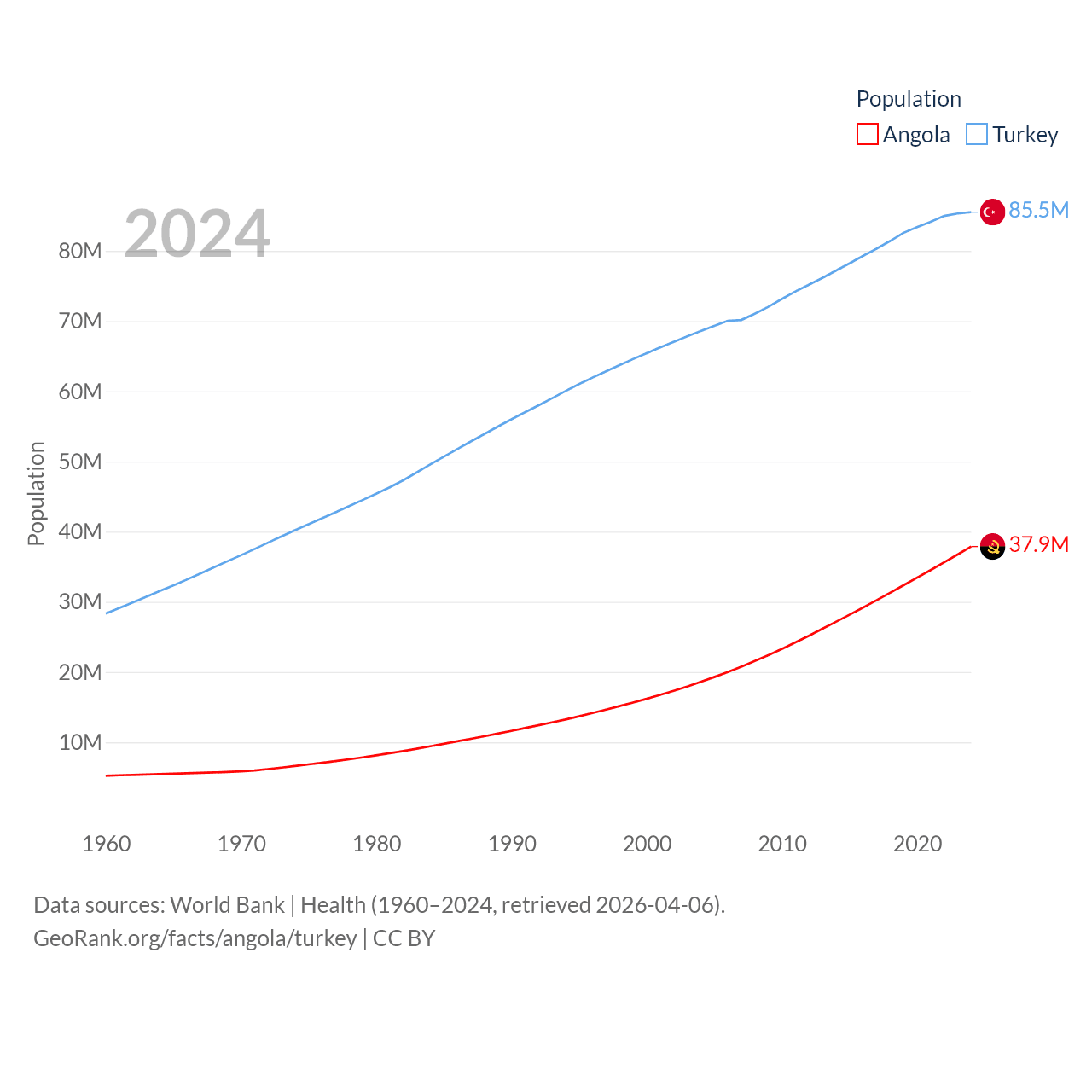 Angola has a population of 37.9M (ranked 40/197), compared with 85.5M in Turkey (ranked 18/197). Angola's land area is 481,354 sq mi versus 297,156 sq mi for Turkey (ranked 22nd vs. 36th).