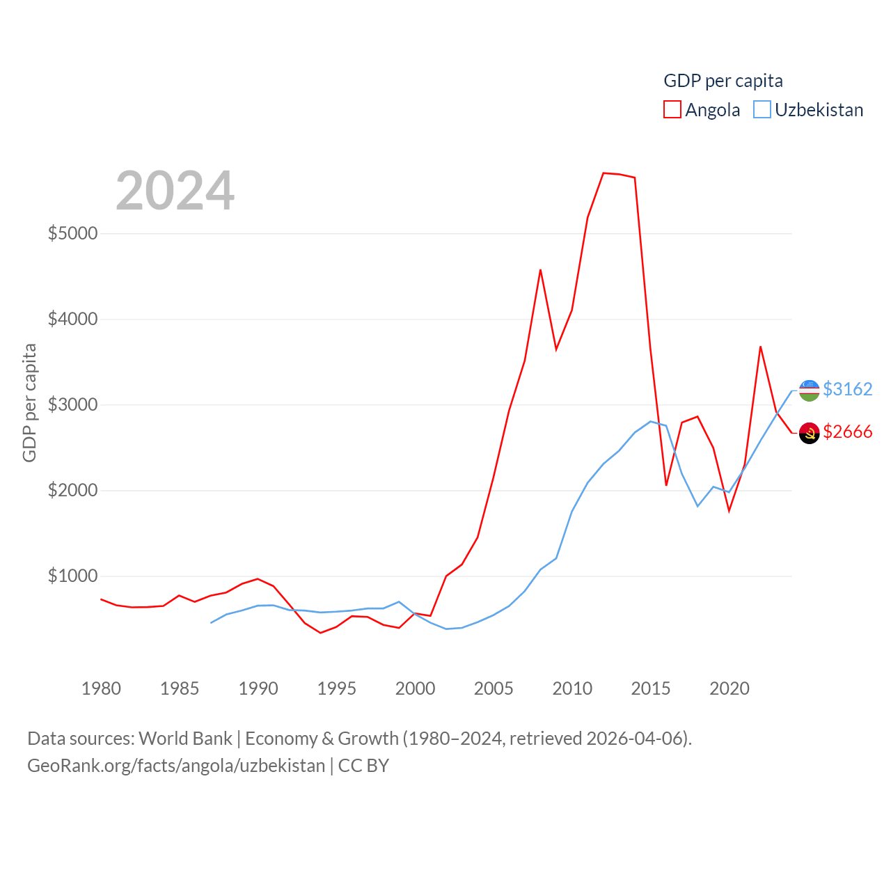 By GDP, Angola ranks 71/197 ($101B) and Uzbekistan ranks 66/197 ($115B). By GDP per capita, Angola ranks 144/197 ($2,666), while Uzbekistan ranks 139/197 ($3,162).