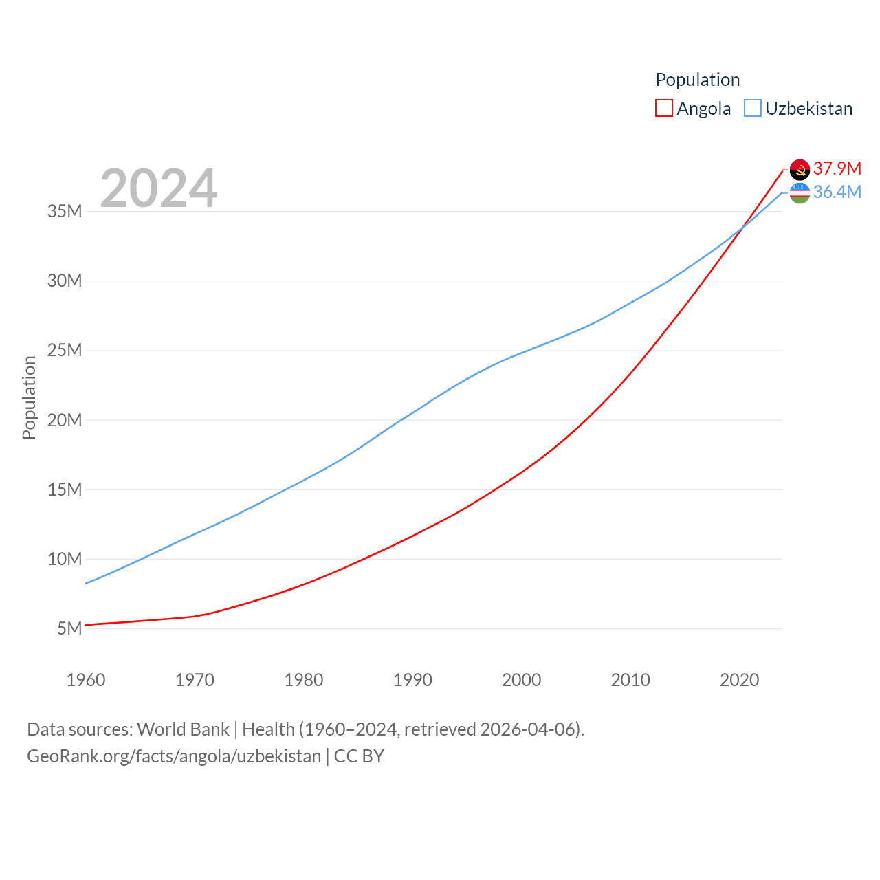 Angola has a population of 37.9M (ranked 40/197), compared with 36.4M in Uzbekistan (ranked 43/197). Angola's land area is 481,354 sq mi versus 170,136 sq mi for Uzbekistan (ranked 22nd vs. 56th).