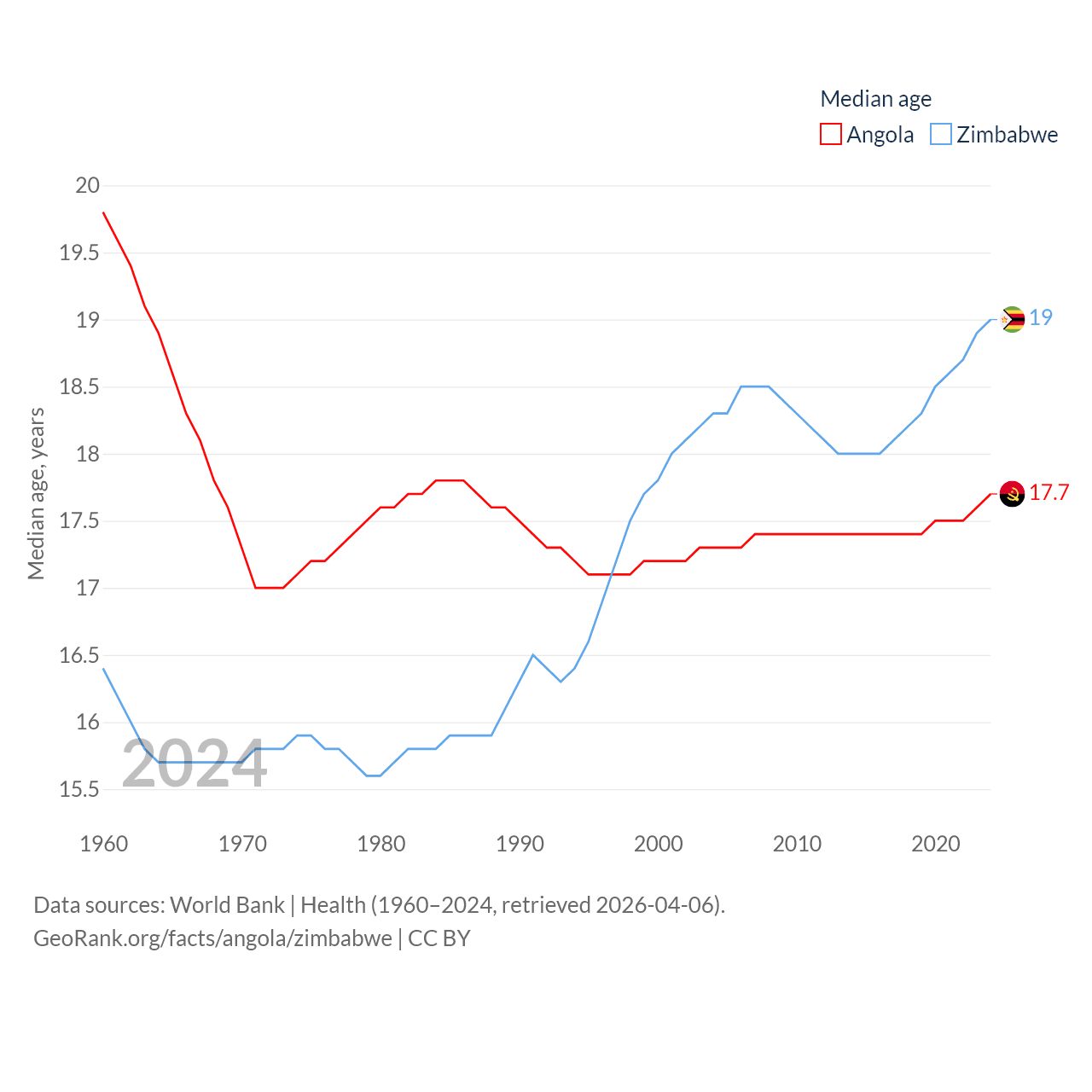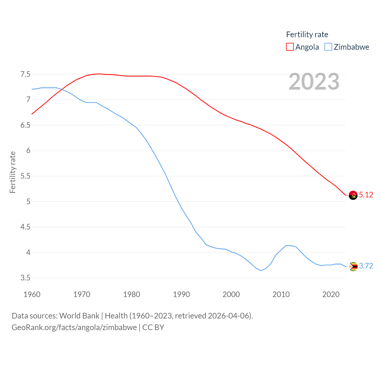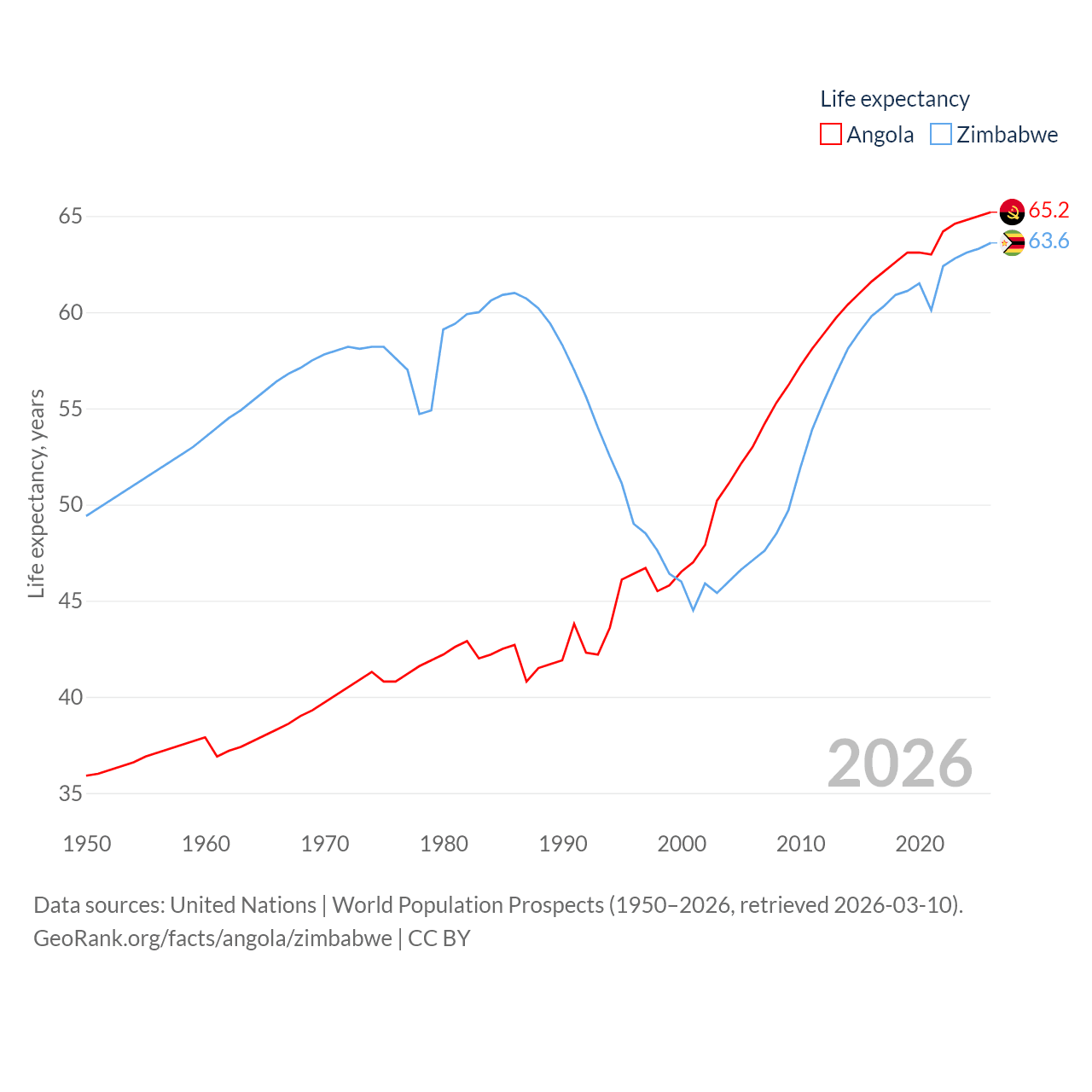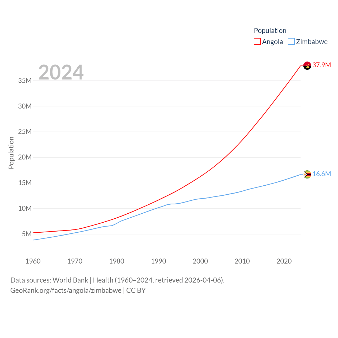 Angola has a population of 37.9M (ranked 40/197), compared with 16.6M in Zimbabwe (ranked 74/197). Angola's land area is 481,354 sq mi versus 149,364 sq mi for Zimbabwe (ranked 22nd vs. 60th).