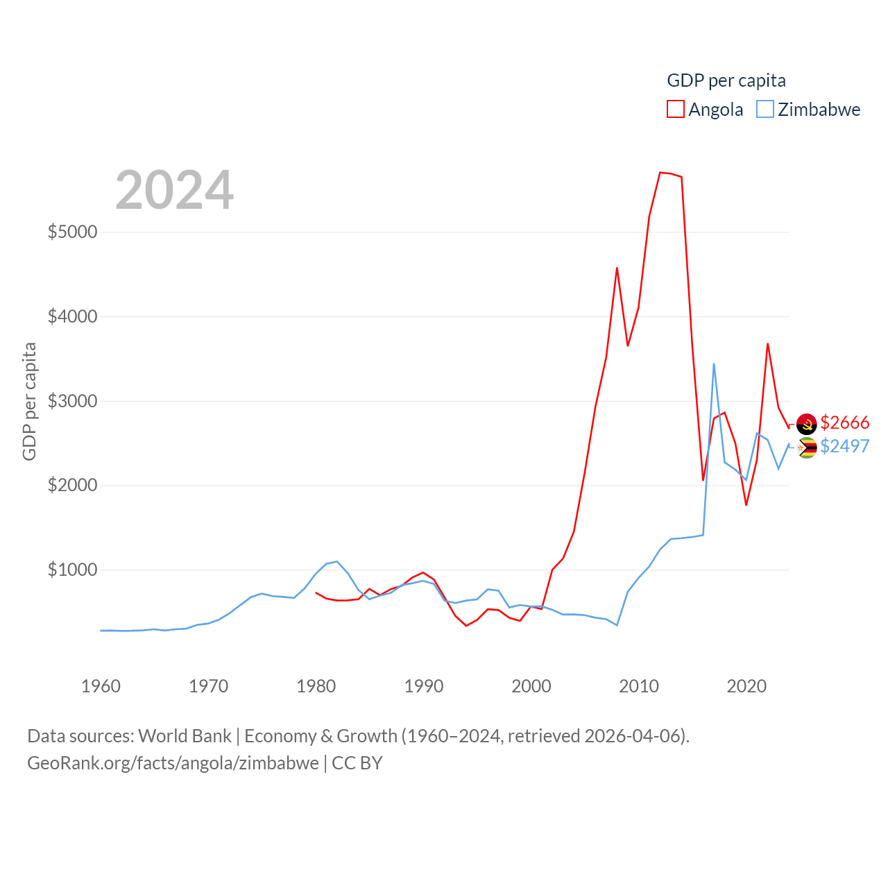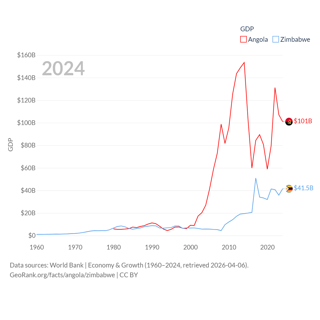 By GDP, Angola ranks 71/197 ($101B) and Zimbabwe ranks 102/197 ($41.5B). By GDP per capita, Angola ranks 144/197 ($2,666), while Zimbabwe ranks 148/197 ($2,497).