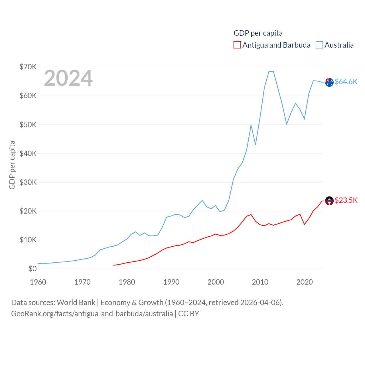 By GDP, Antigua and Barbuda ranks 177/197 ($2.21B) and Australia ranks 14/197 ($1.76T). By GDP per capita, Antigua and Barbuda ranks 53/197 ($23,542), while Australia ranks 14/197 ($64,604).