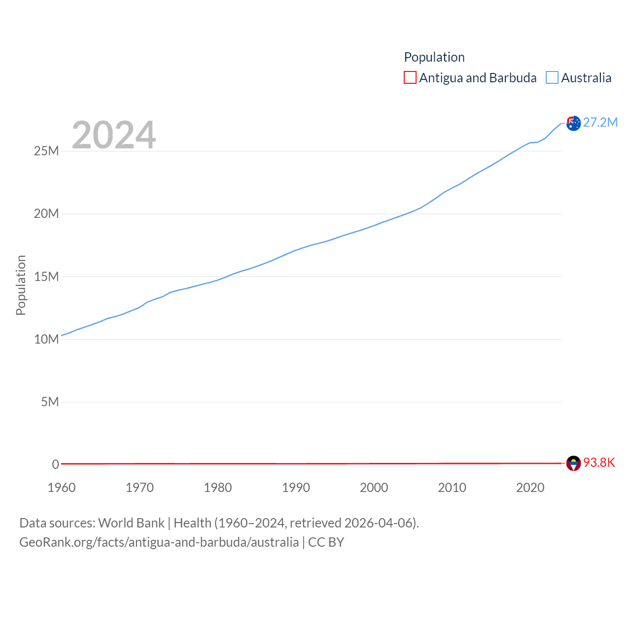Antigua and Barbuda has a population of 93.8K (ranked 185/197), compared with 27.2M in Australia (ranked 54/197). Antigua and Barbuda's land area is 169.9 sq mi versus 2,969,906 sq mi for Australia (ranked 183rd vs. 6th).