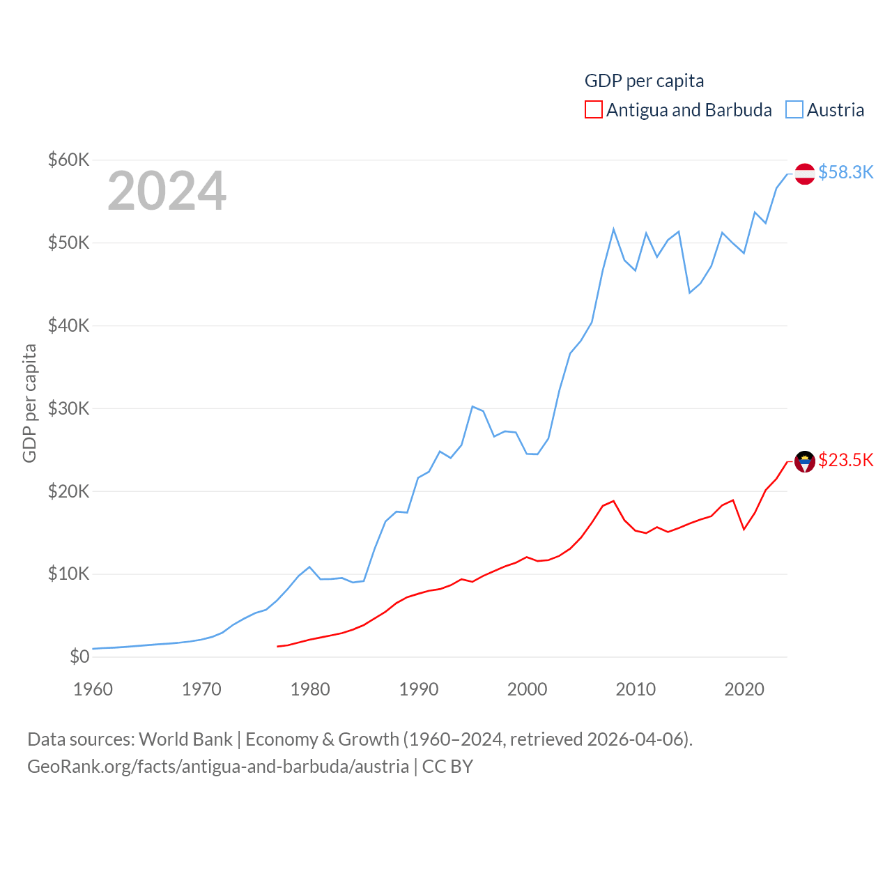 By GDP, Antigua and Barbuda ranks 177/197 ($2.21B) and Austria ranks 30/197 ($535B). By GDP per capita, Antigua and Barbuda ranks 53/197 ($23,542), while Austria ranks 16/197 ($58,269).