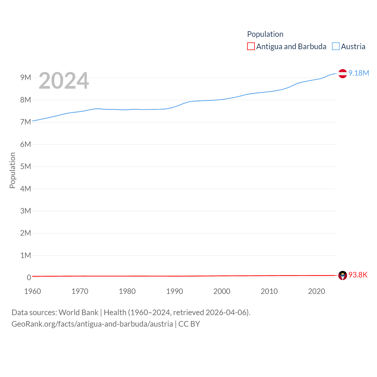 Antigua and Barbuda has a population of 93.8K (ranked 185/197), compared with 9.18M in Austria (ranked 99/197). Antigua and Barbuda's land area is 169.9 sq mi versus 31,861 sq mi for Austria (ranked 183rd vs. 113th).