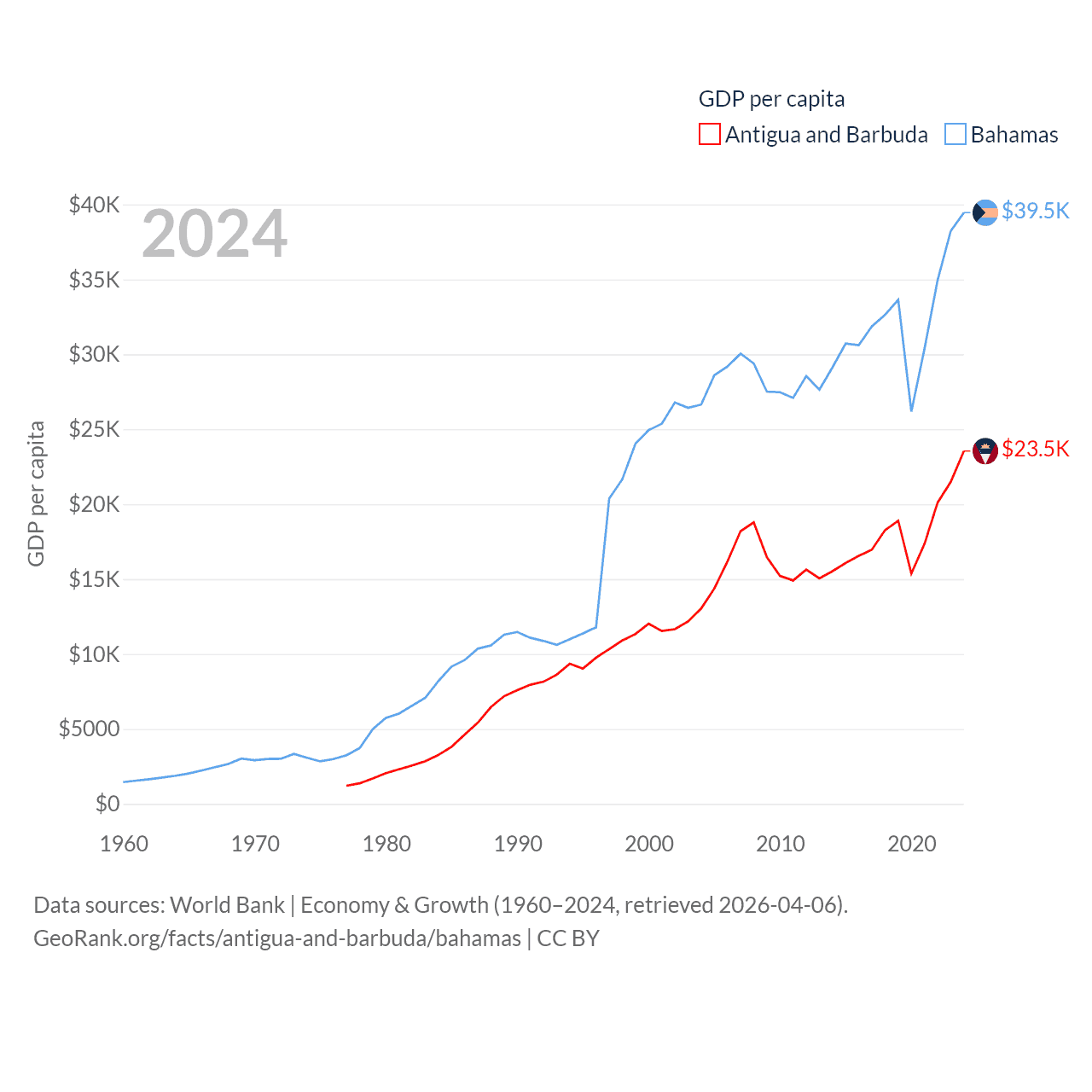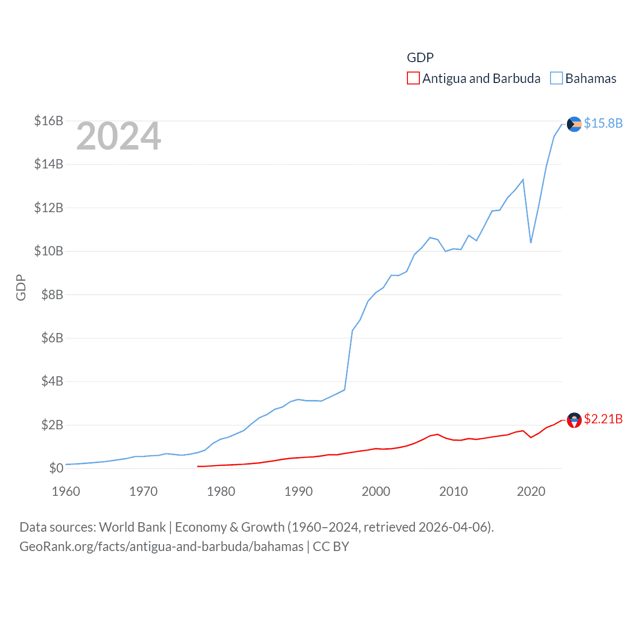 By GDP, Antigua and Barbuda ranks 177/197 ($2.21B) and The Bahamas ranks 140/197 ($15.8B). By GDP per capita, Antigua and Barbuda ranks 53/197 ($23,542), while The Bahamas ranks 30/197 ($39,455).