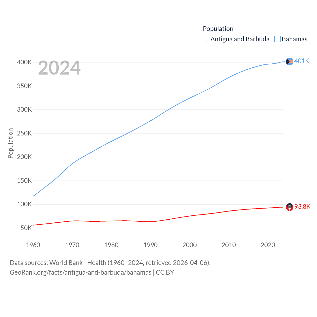 Antigua and Barbuda has a population of 93.8K (ranked 185/197), compared with 401K in The Bahamas (ranked 172/197). Antigua and Barbuda's land area is 169.9 sq mi versus 3,865 sq mi for The Bahamas (ranked 183rd vs. 162nd).
