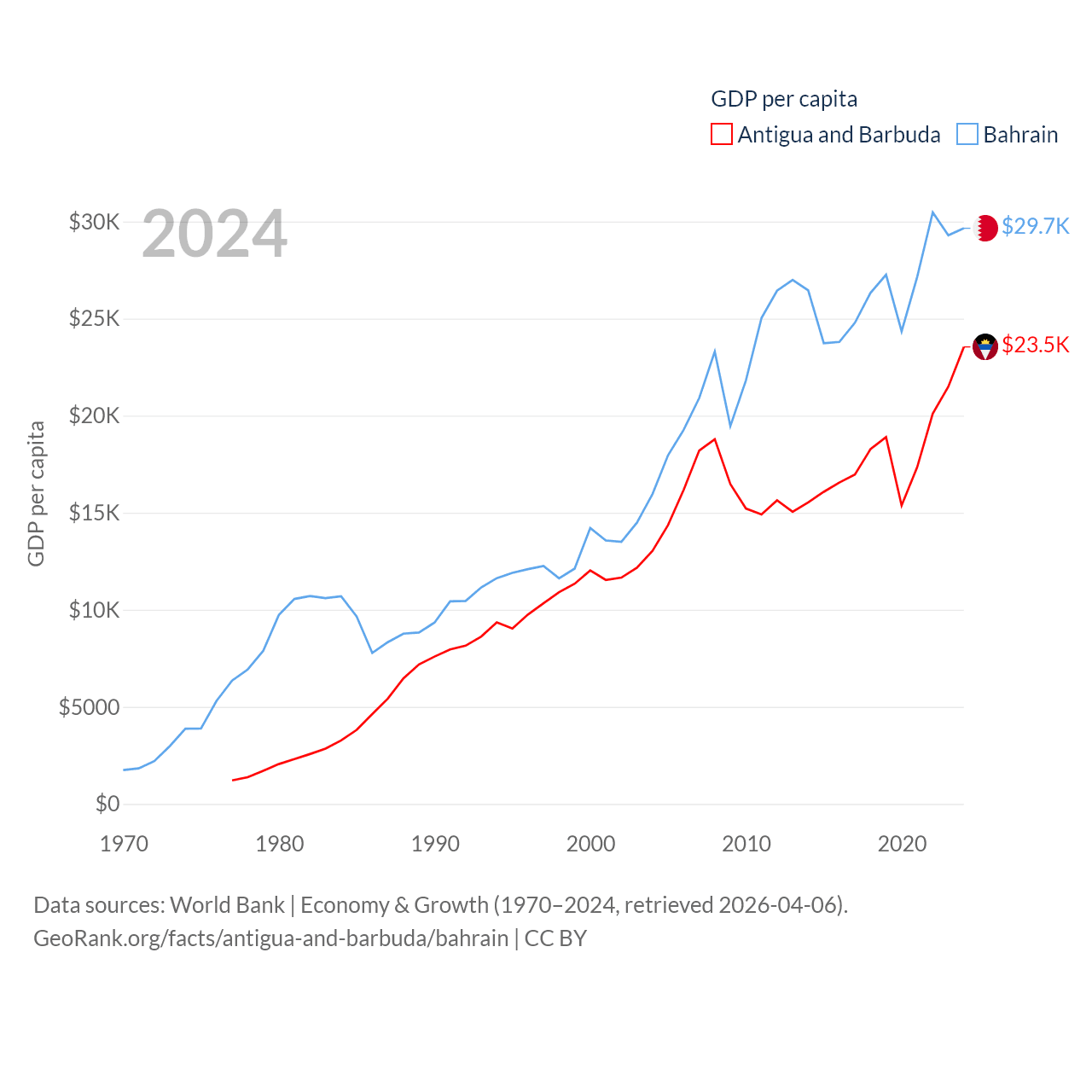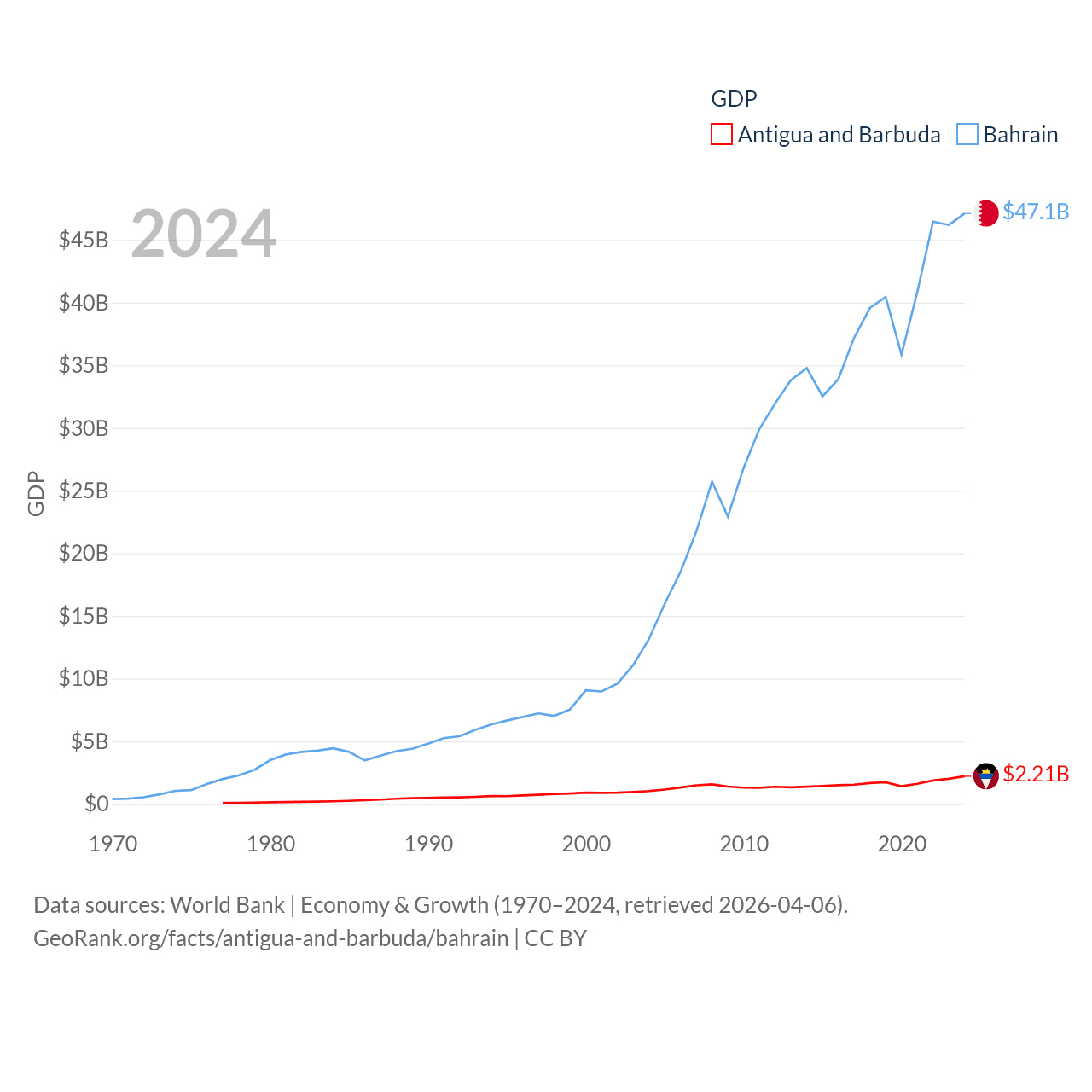 By GDP, Antigua and Barbuda ranks 177/197 ($2.21B) and Bahrain ranks 96/197 ($47.1B). By GDP per capita, Antigua and Barbuda ranks 53/197 ($23,542), while Bahrain ranks 42/197 ($29,654).