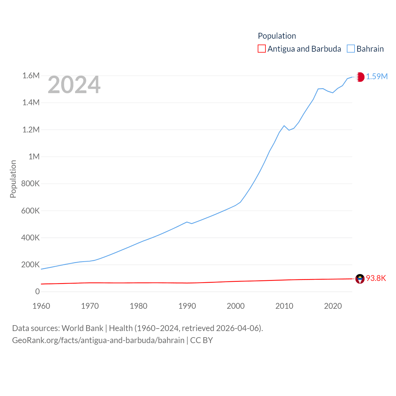 Antigua and Barbuda has a population of 93.8K (ranked 185/197), compared with 1.59M in Bahrain (ranked 151/197). Antigua and Barbuda's land area is 169.9 sq mi versus 309 sq mi for Bahrain (ranked 183rd vs. 174th).