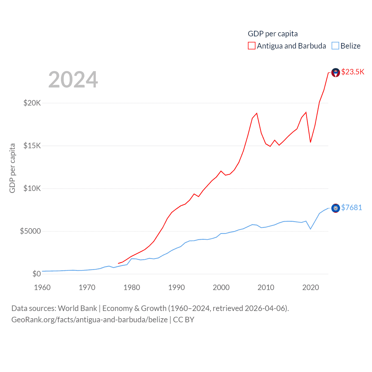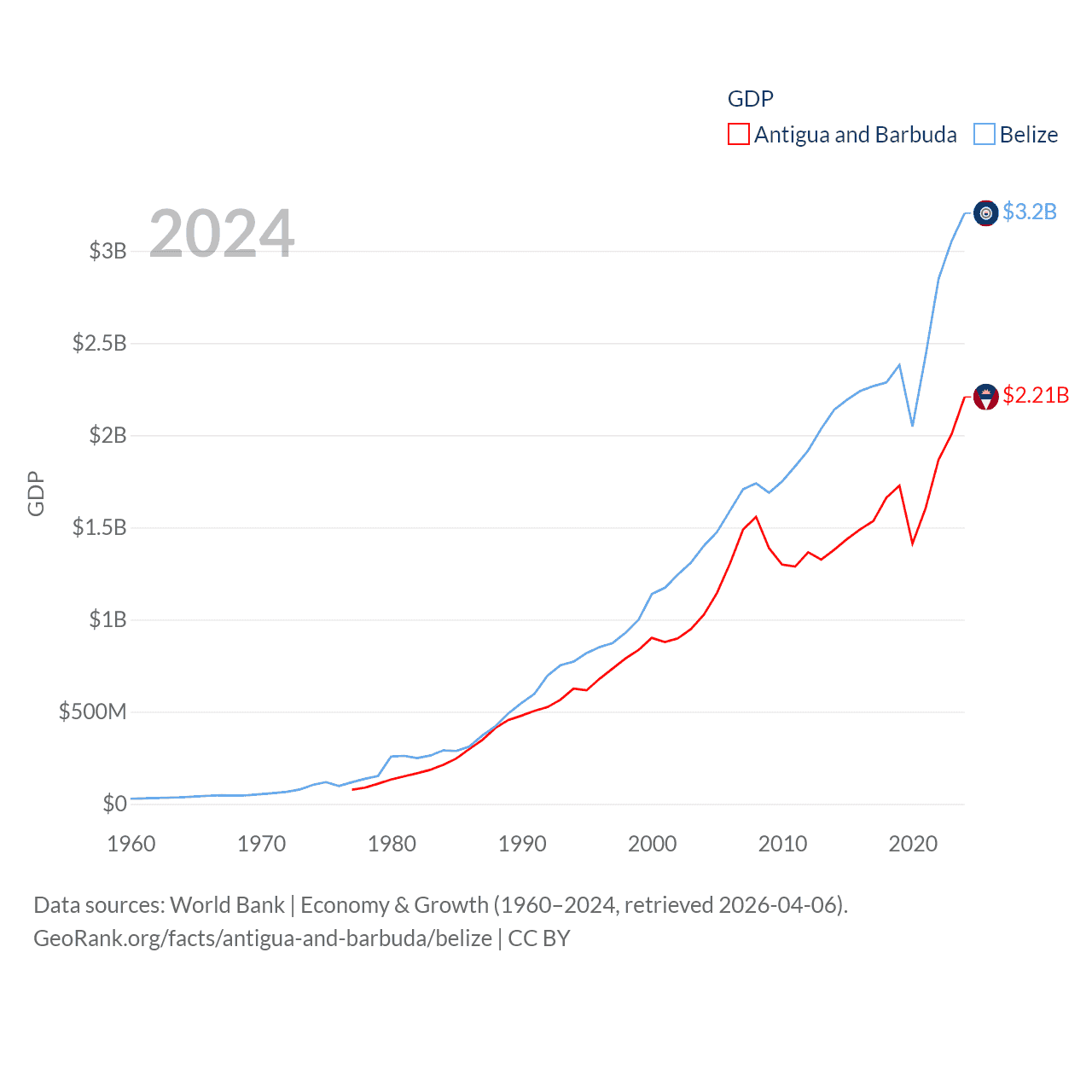 By GDP, Antigua and Barbuda ranks 177/197 ($2.21B) and Belize ranks 168/197 ($3.2B). By GDP per capita, Antigua and Barbuda ranks 53/197 ($23,542), while Belize ranks 98/197 ($7,681).