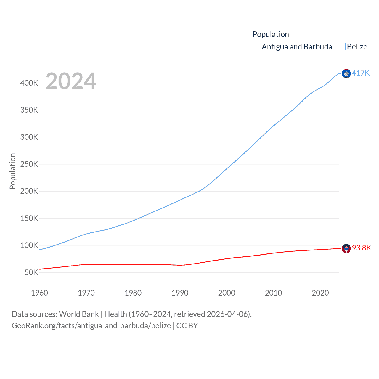 Antigua and Barbuda has a population of 93.8K (ranked 185/197), compared with 417K in Belize (ranked 171/197). Antigua and Barbuda's land area is 169.9 sq mi versus 8,807 sq mi for Belize (ranked 183rd vs. 148th).