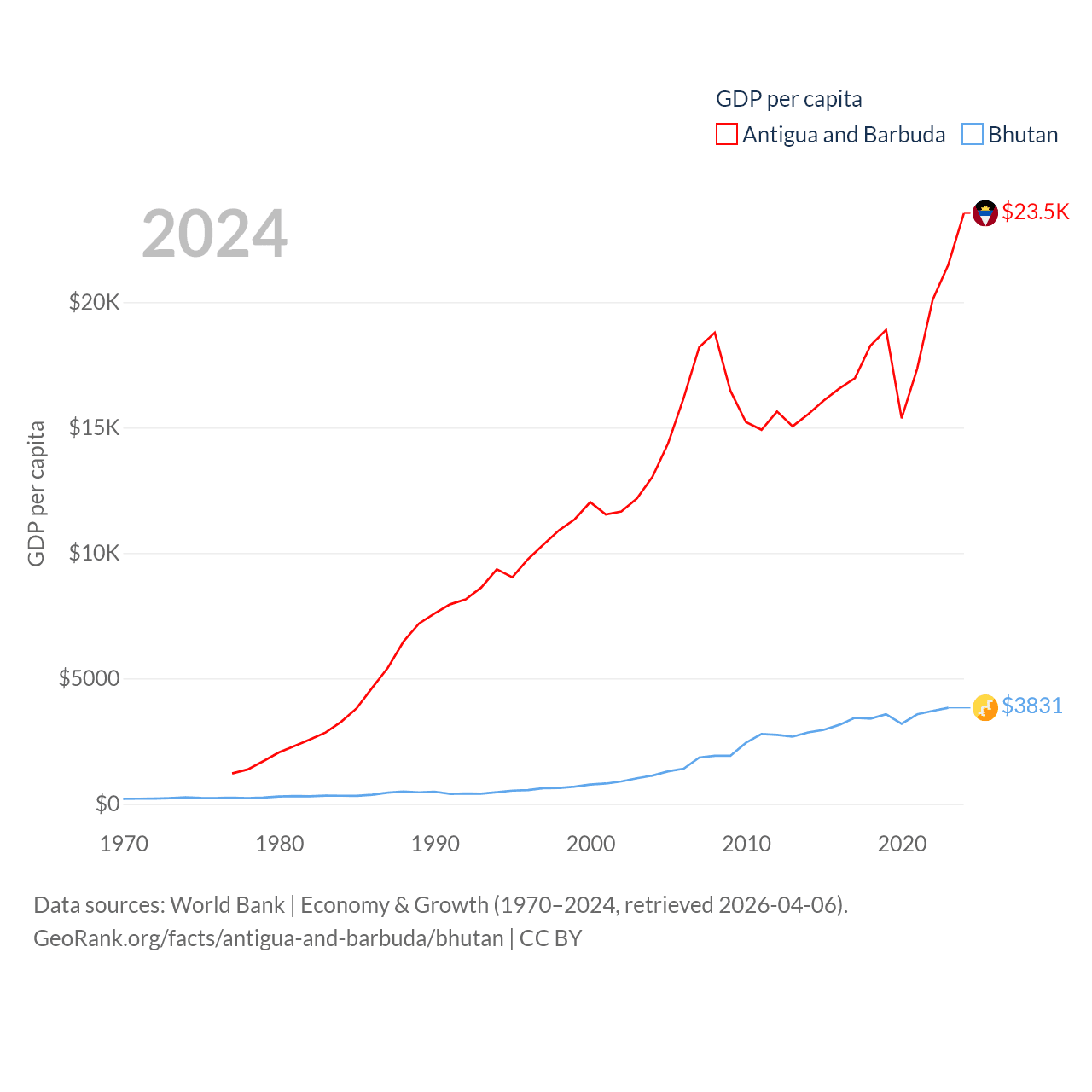 By GDP, Antigua and Barbuda ranks 177/197 ($2.21B) and Bhutan ranks 170/197 ($3.01B). By GDP per capita, Antigua and Barbuda ranks 53/197 ($23,542), while Bhutan ranks 132/197 ($3,831).