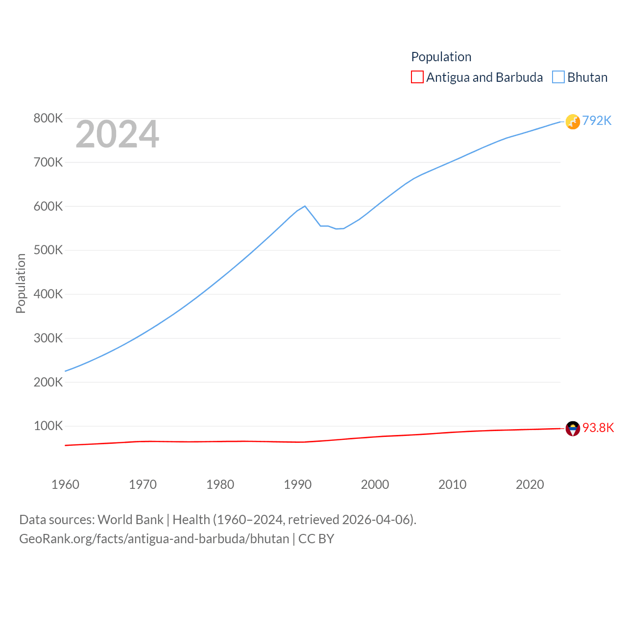 Antigua and Barbuda has a population of 93.8K (ranked 185/197), compared with 792K in Bhutan (ranked 163/197). Antigua and Barbuda's land area is 169.9 sq mi versus 14,726 sq mi for Bhutan (ranked 183rd vs. 132nd).