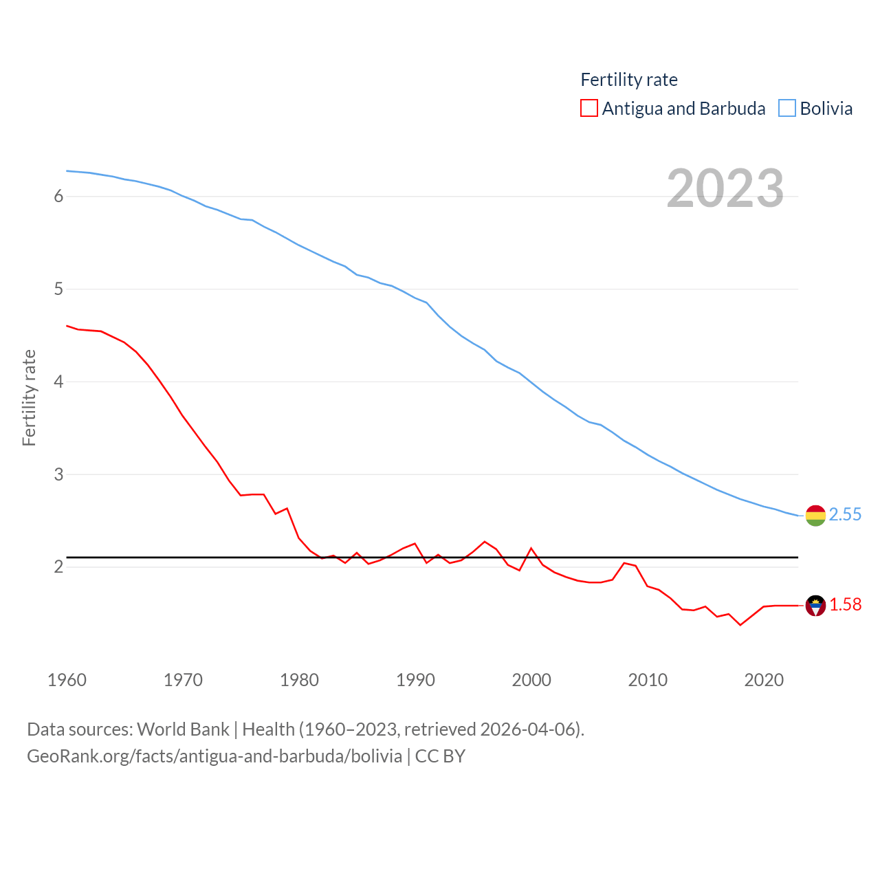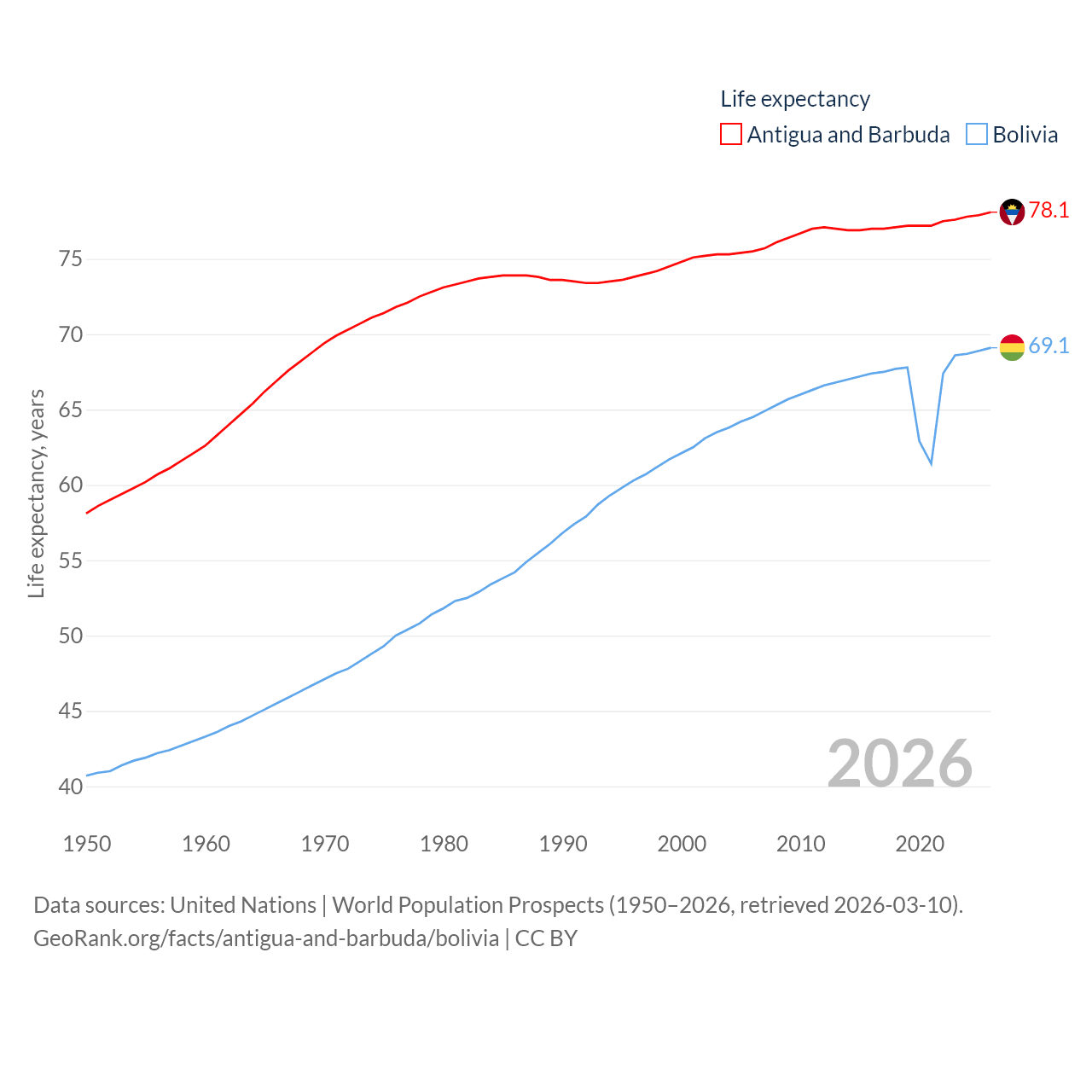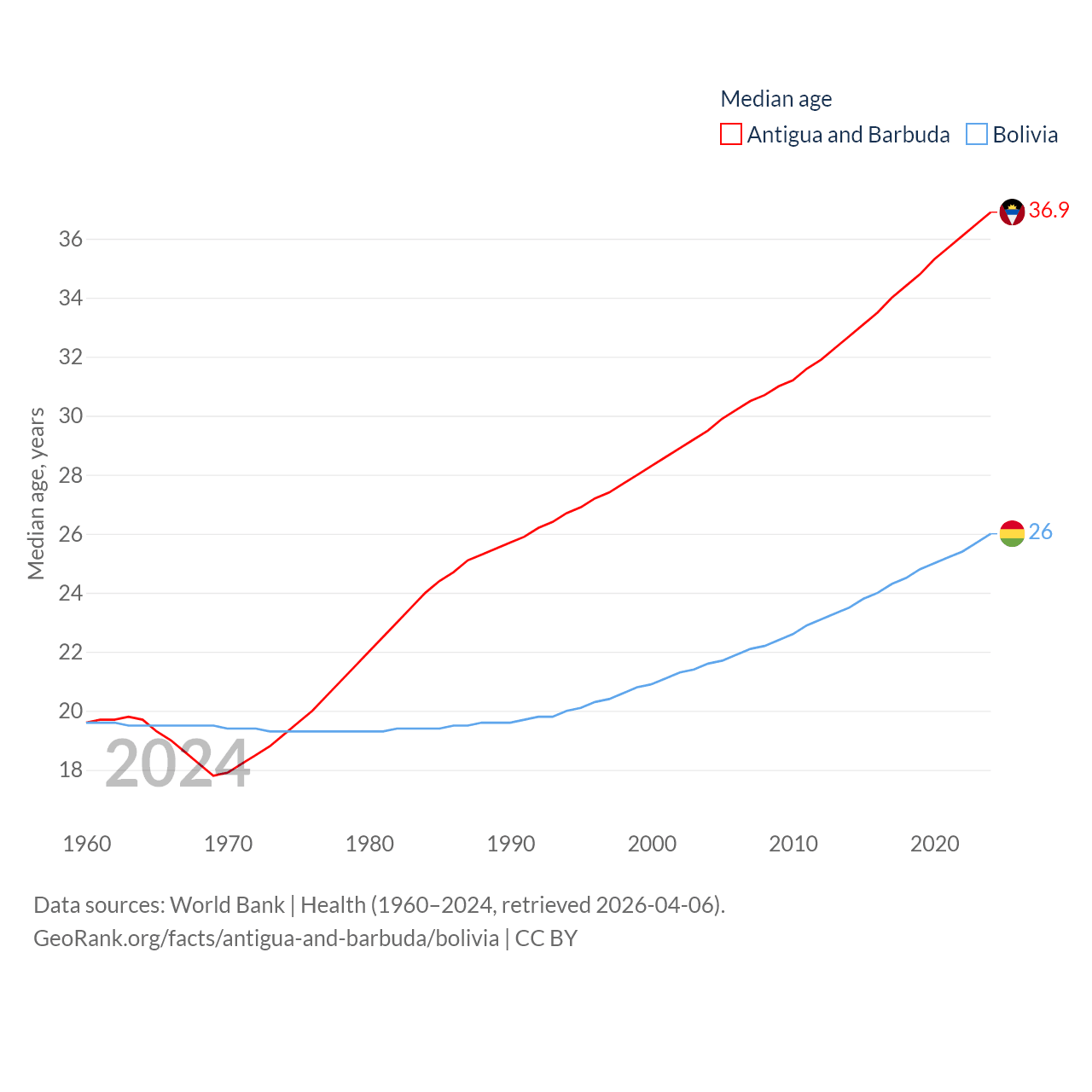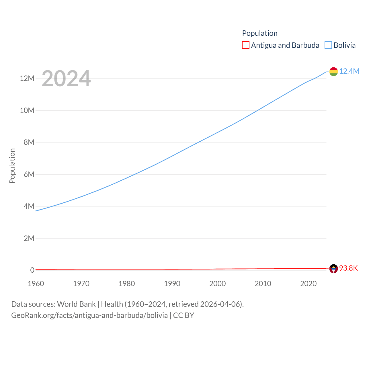 Antigua and Barbuda has a population of 93.8K (ranked 185/197), compared with 12.4M in Bolivia (ranked 79/197). Antigua and Barbuda's land area is 169.9 sq mi versus 418,264 sq mi for Bolivia (ranked 183rd vs. 27th).