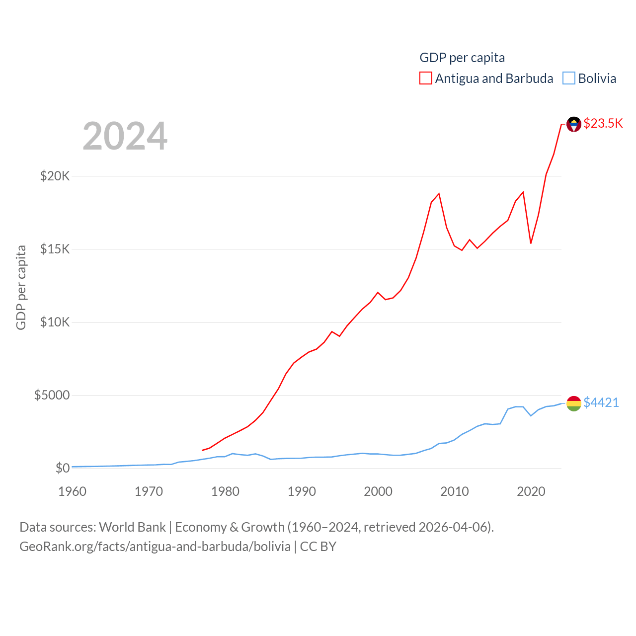 By GDP, Antigua and Barbuda ranks 177/197 ($2.21B) and Bolivia ranks 88/197 ($54.9B). By GDP per capita, Antigua and Barbuda ranks 53/197 ($23,542), while Bolivia ranks 125/197 ($4,421).