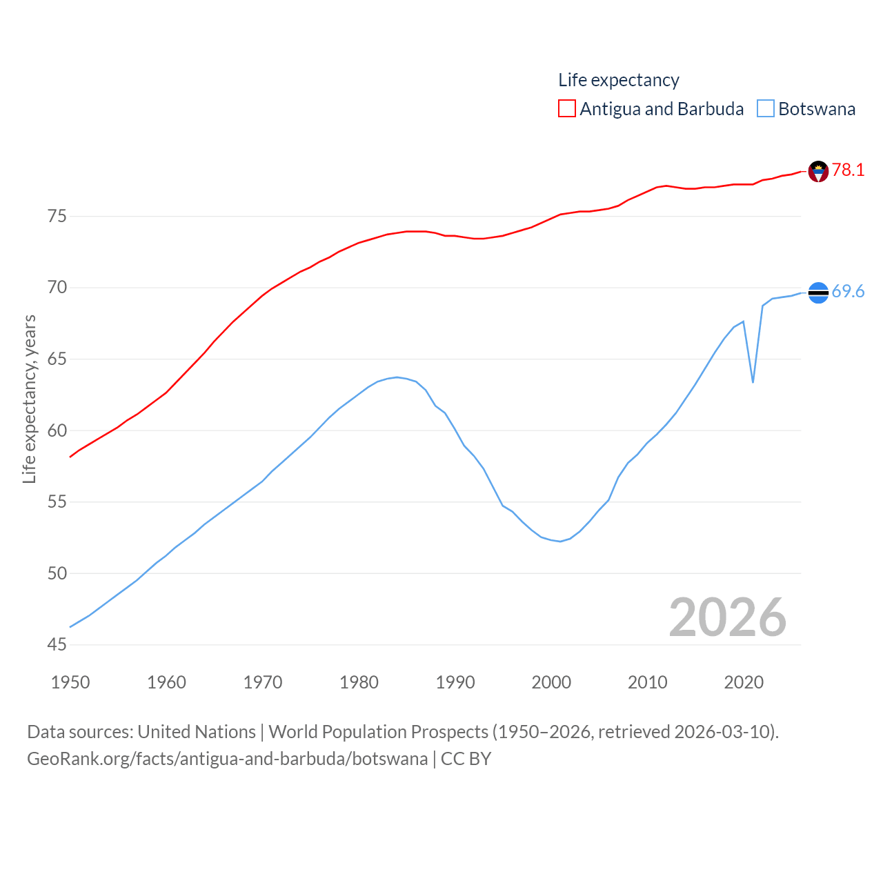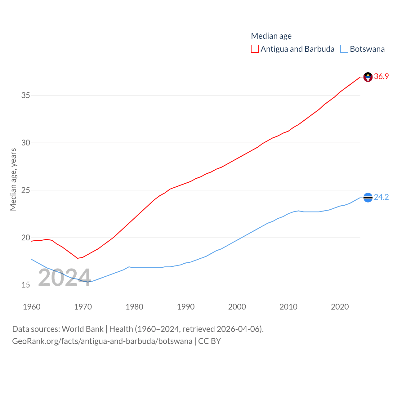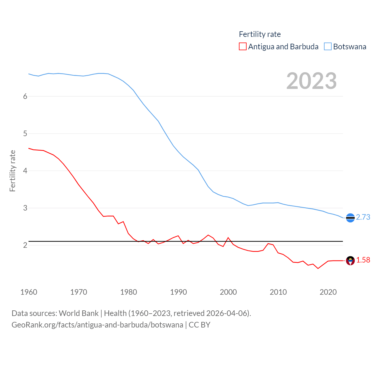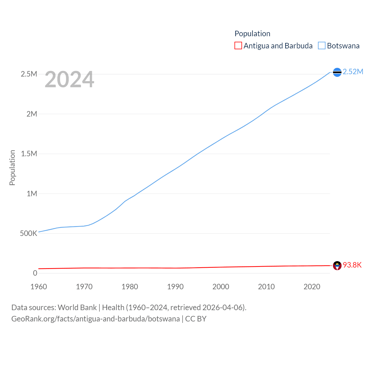 Antigua and Barbuda has a population of 93.8K (ranked 185/197), compared with 2.52M in Botswana (ranked 142/197). Antigua and Barbuda's land area is 169.9 sq mi versus 218,816 sq mi for Botswana (ranked 183rd vs. 47th).