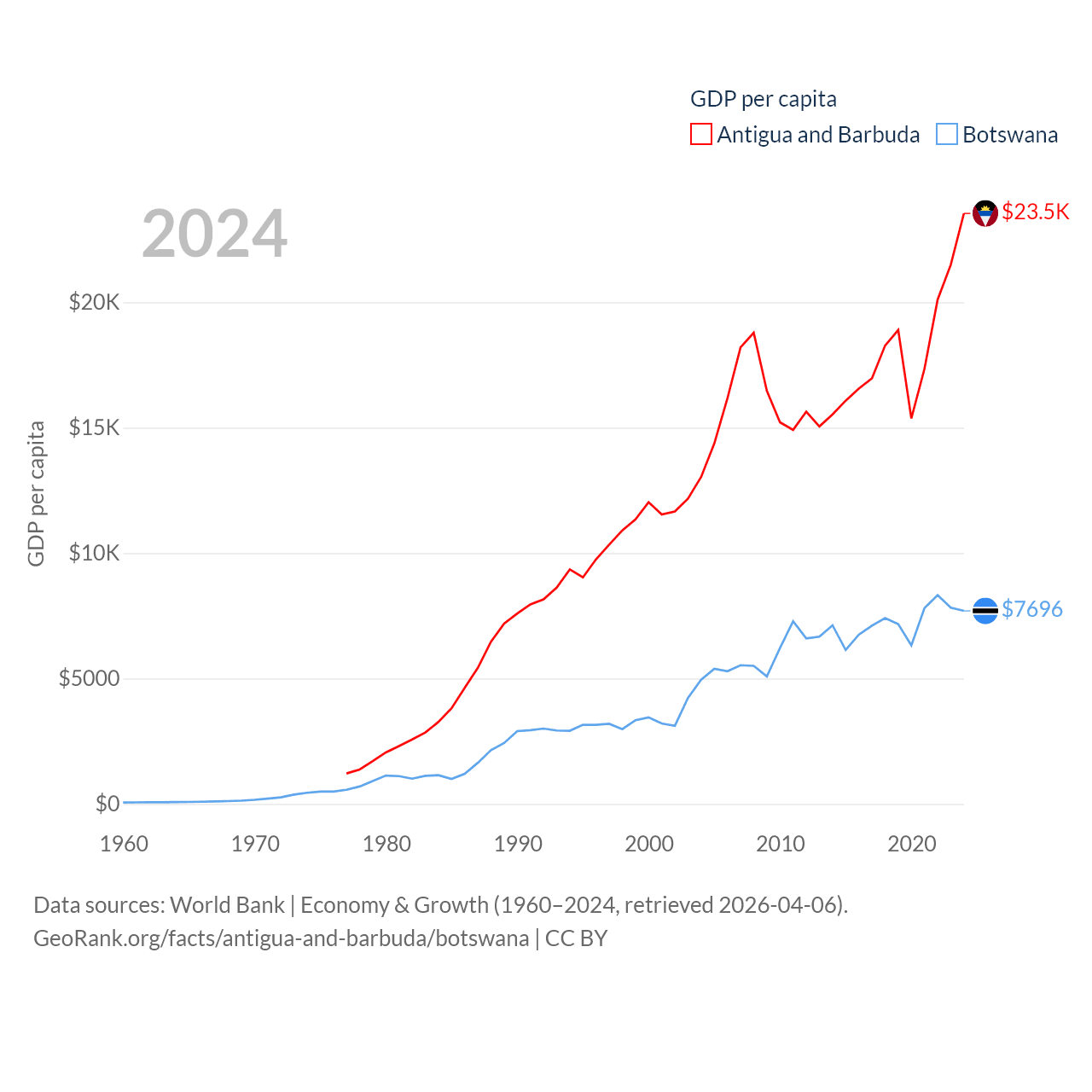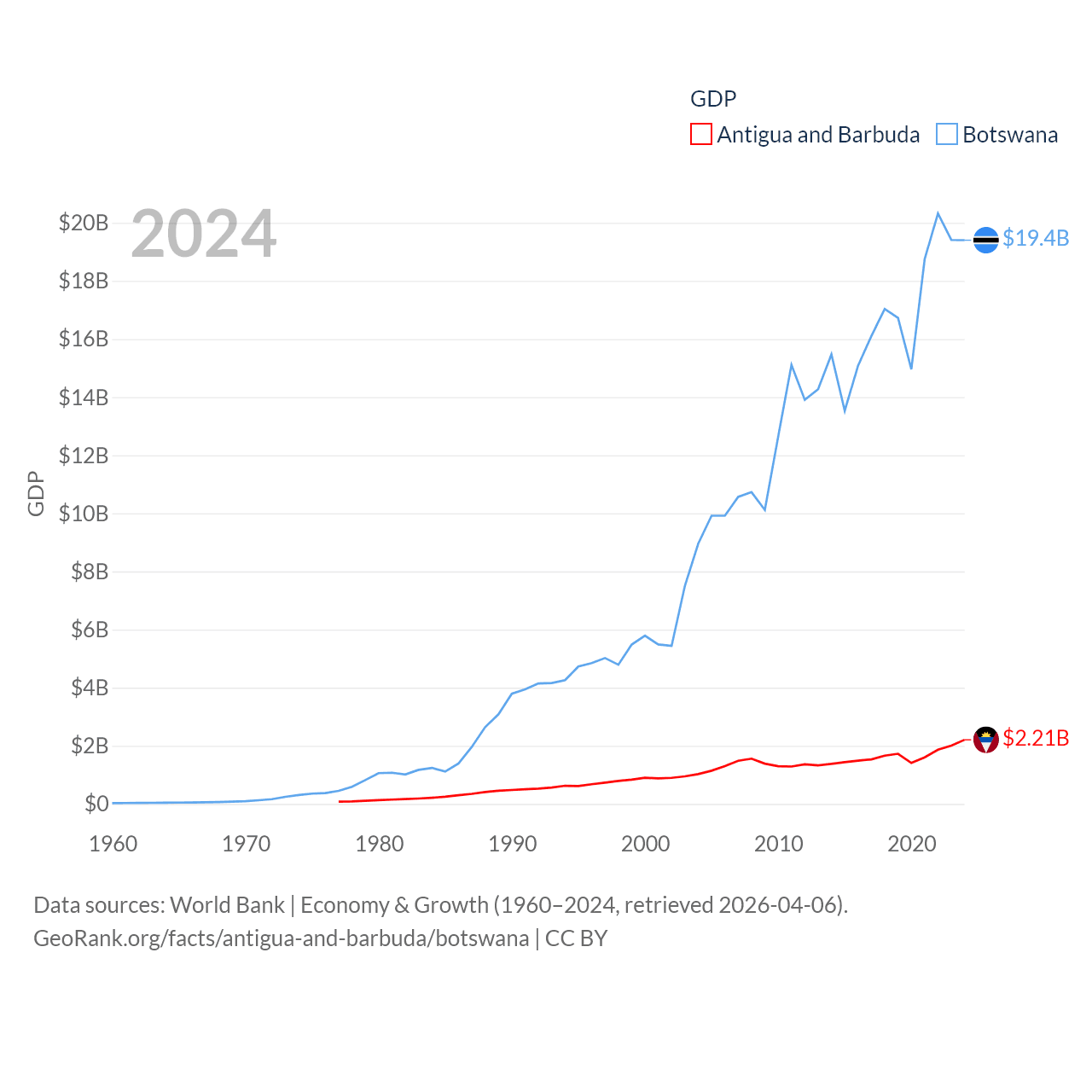 By GDP, Antigua and Barbuda ranks 177/197 ($2.21B) and Botswana ranks 133/197 ($19.4B). By GDP per capita, Antigua and Barbuda ranks 53/197 ($23,542), while Botswana ranks 97/197 ($7,696).