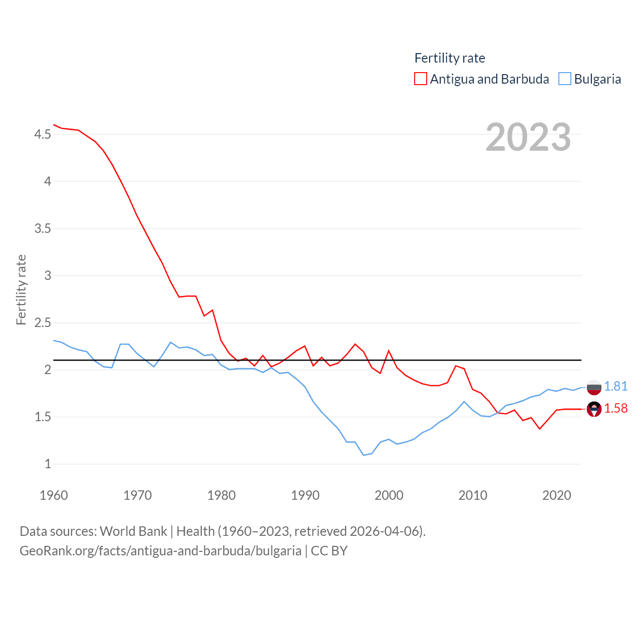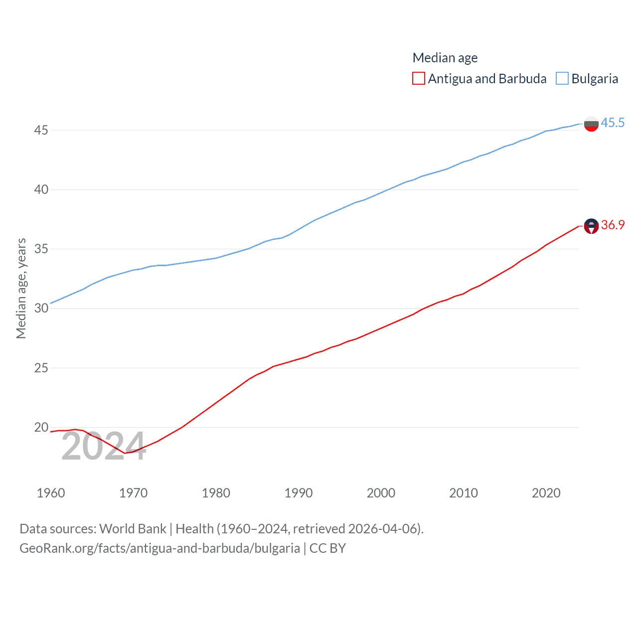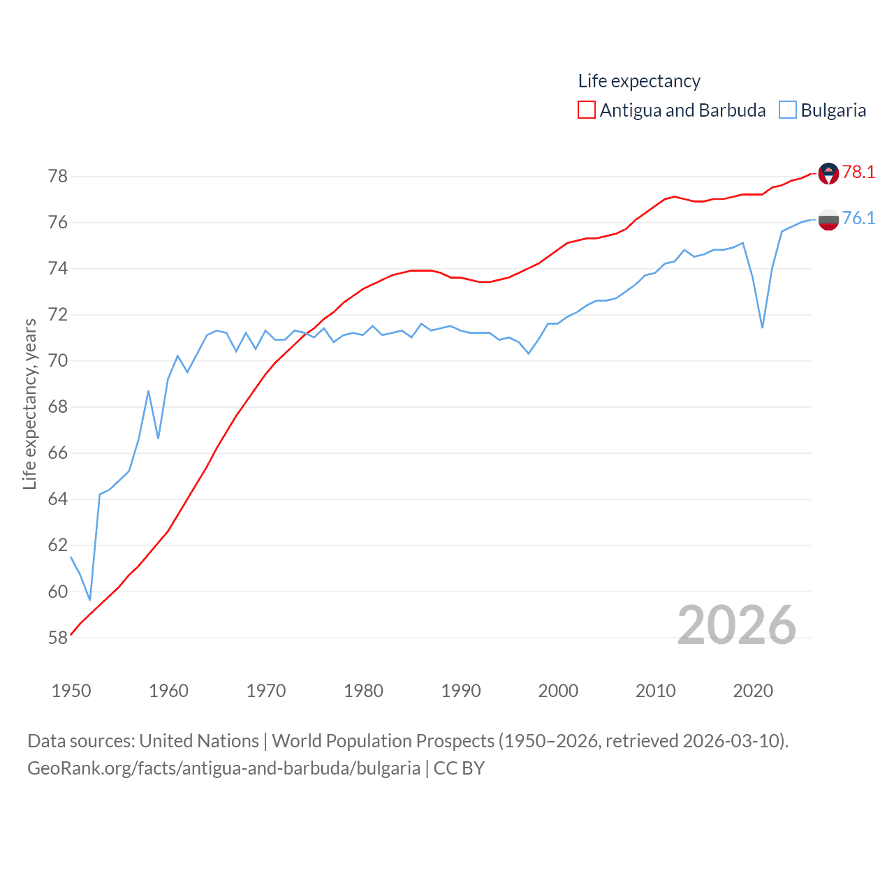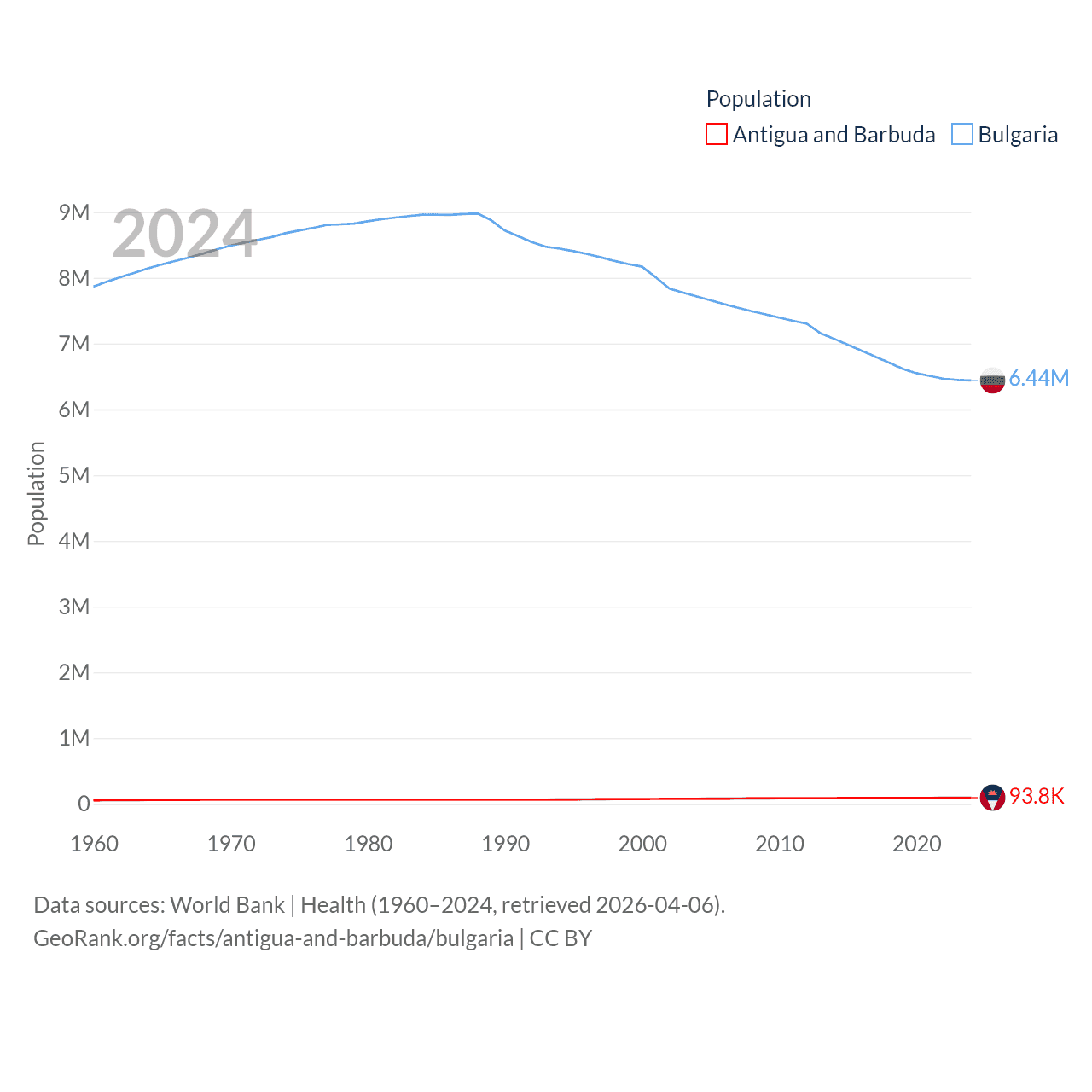 Antigua and Barbuda has a population of 93.8K (ranked 185/197), compared with 6.44M in Bulgaria (ranked 110/197). Antigua and Barbuda's land area is 169.9 sq mi versus 41,915 sq mi for Bulgaria (ranked 183rd vs. 101st).