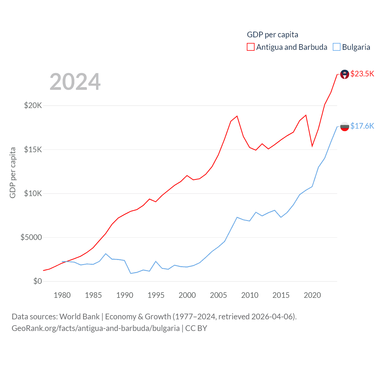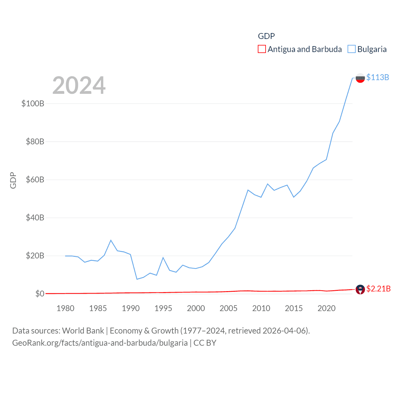 By GDP, Antigua and Barbuda ranks 177/197 ($2.21B) and Bulgaria ranks 67/197 ($113B). By GDP per capita, Antigua and Barbuda ranks 53/197 ($23,542), while Bulgaria ranks 64/197 ($17,596).