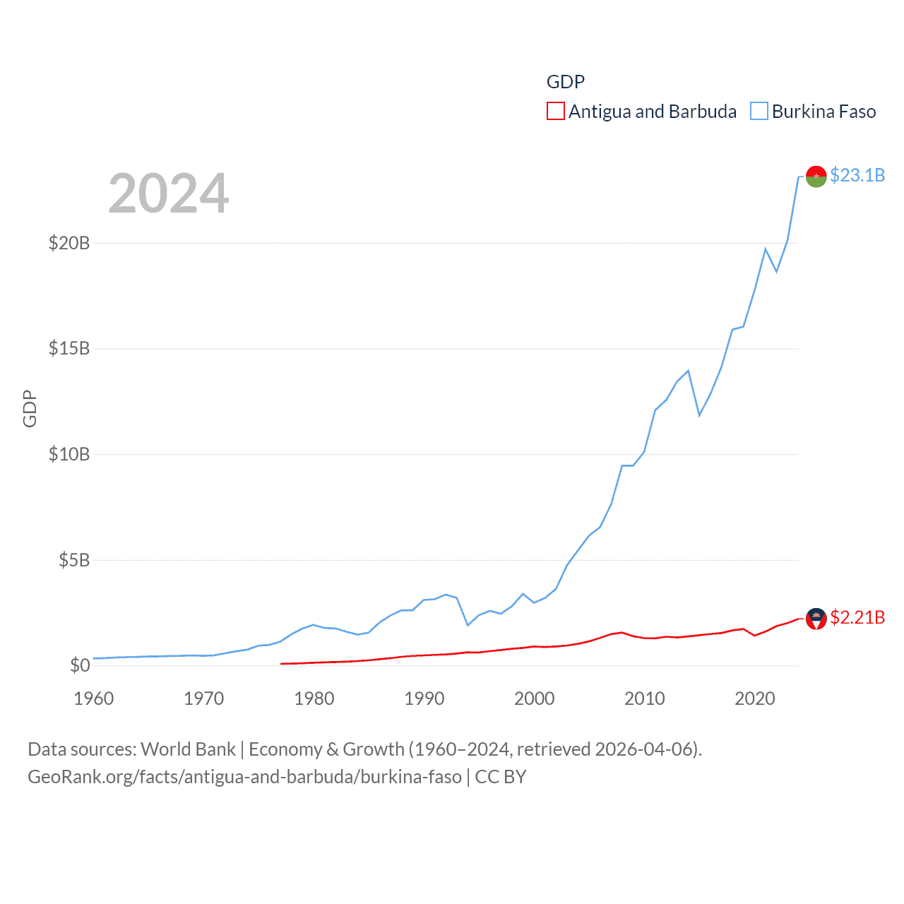 By GDP, Antigua and Barbuda ranks 177/197 ($2.21B) and Burkina Faso ranks 122/197 ($23.1B). By GDP per capita, Antigua and Barbuda ranks 53/197 ($23,542), while Burkina Faso ranks 180/197 ($982).