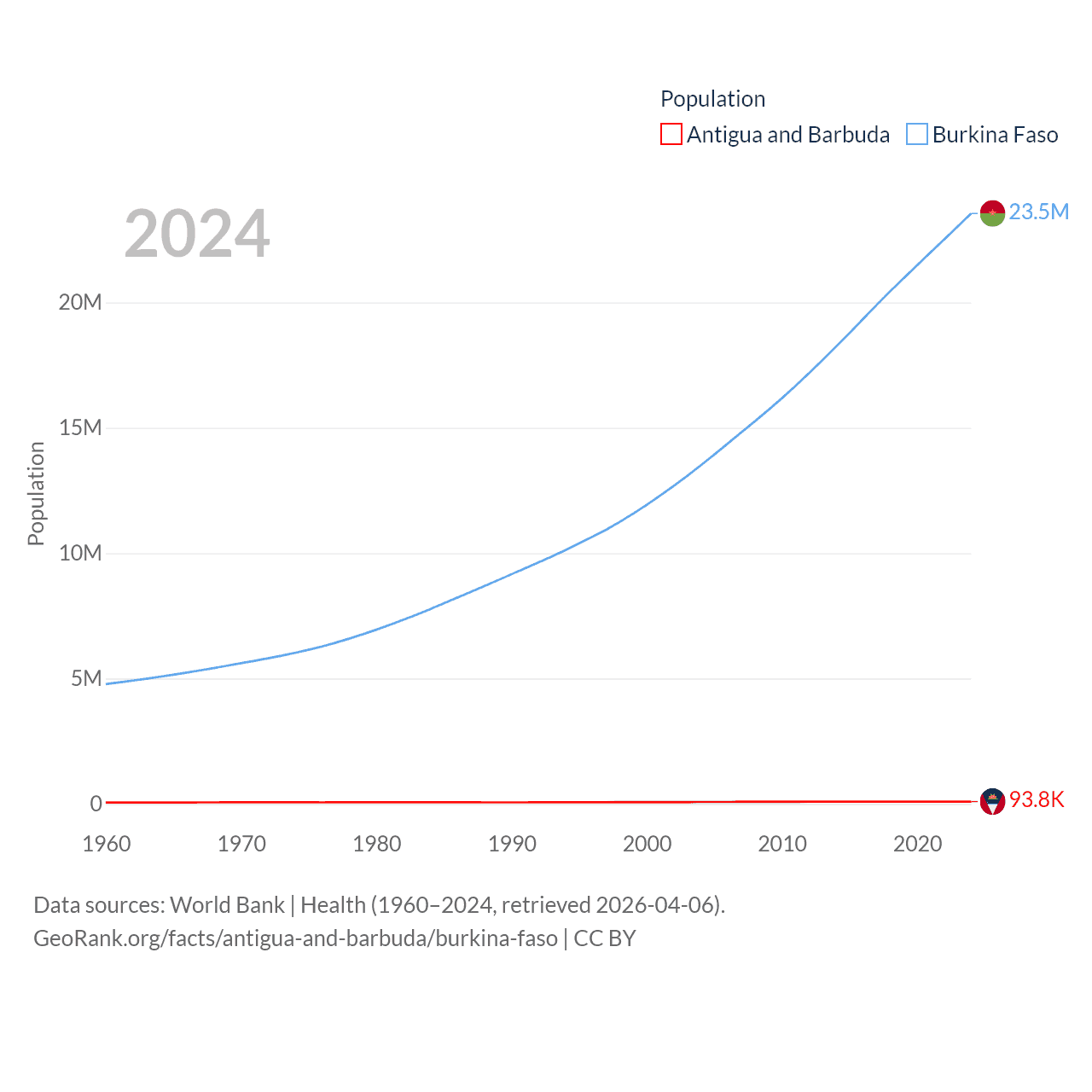 Antigua and Barbuda has a population of 93.8K (ranked 185/197), compared with 23.5M in Burkina Faso (ranked 59/197). Antigua and Barbuda's land area is 169.9 sq mi versus 105,638 sq mi for Burkina Faso (ranked 183rd vs. 73rd).
