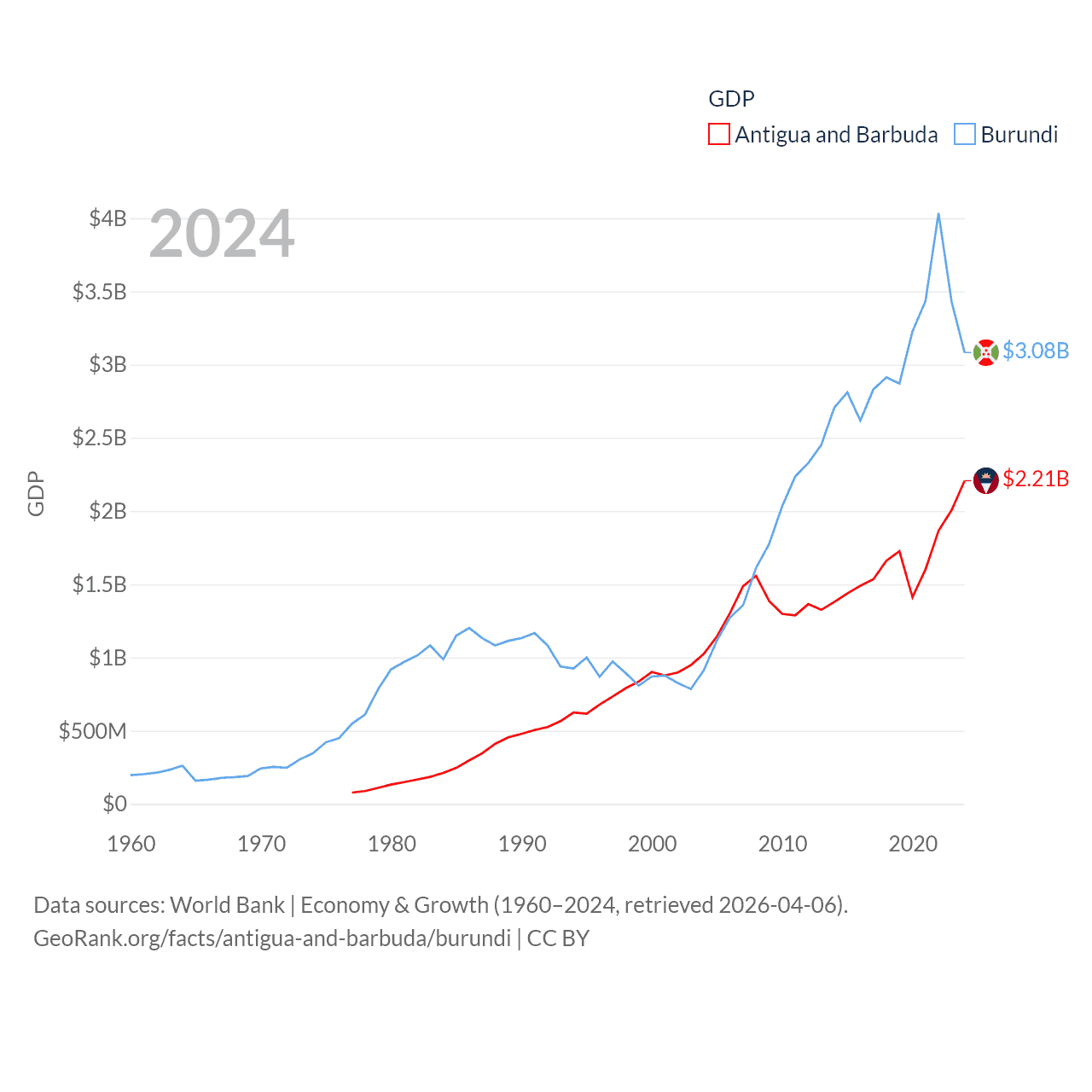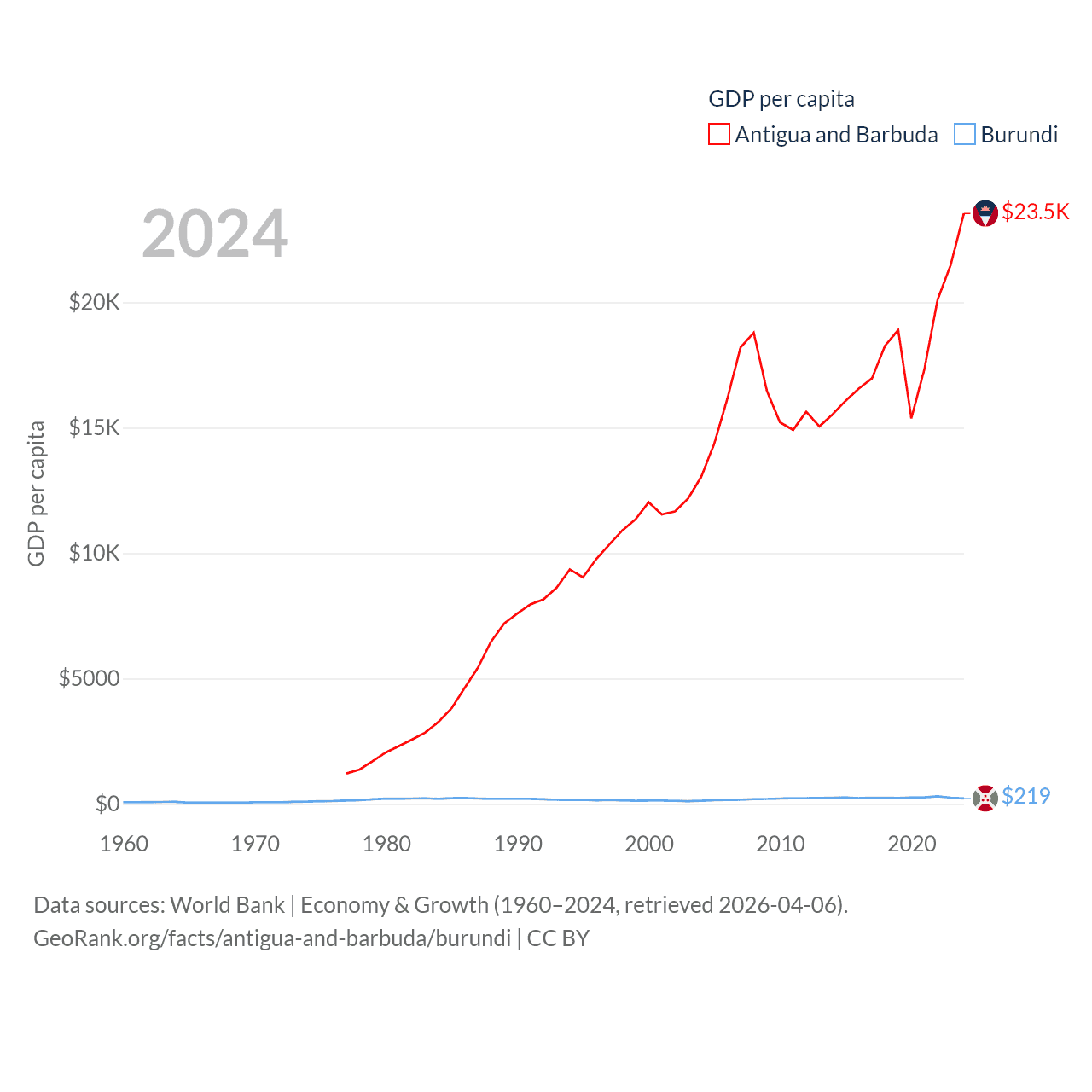 By GDP, Antigua and Barbuda ranks 177/197 ($2.21B) and Burundi ranks 169/197 ($3.08B). By GDP per capita, Antigua and Barbuda ranks 53/197 ($23,542), while Burundi ranks 197/197 ($219.4).